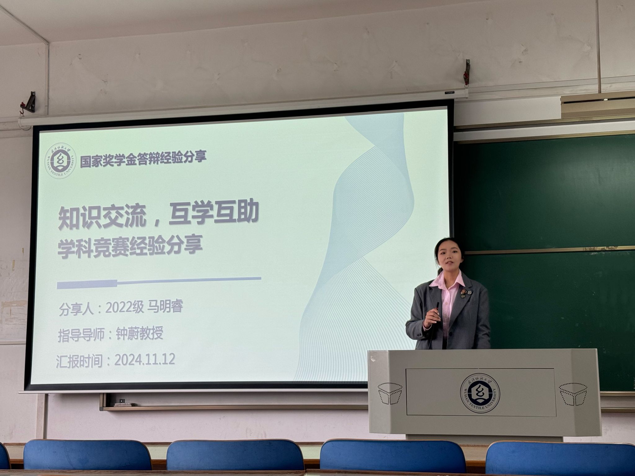 马明睿同学以“知识交流,互助互学---学科竞赛经验分享”为主题,分享了其读研期间的参赛经历,详细介绍了专业类赛事与综合类赛事的参赛要求及基本流程,并针对研究生学习规划提出了建设性的建议,她认为在研究生阶段,需要努力提升将专业知识有效转化为实践的能力,学科竞赛是提升该能力的有效途径。