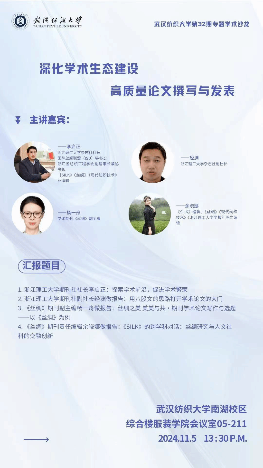 于 2024 年 11 月 5 日举办了关于高质量论文撰写与发表的学术论坛,论坛邀请了浙江理工大学杂志社副社长经渊,《丝绸》杂志副主编杨一舟,《丝绸》杂志责任编辑余晓娜前来交流学习。论坛由百合小说