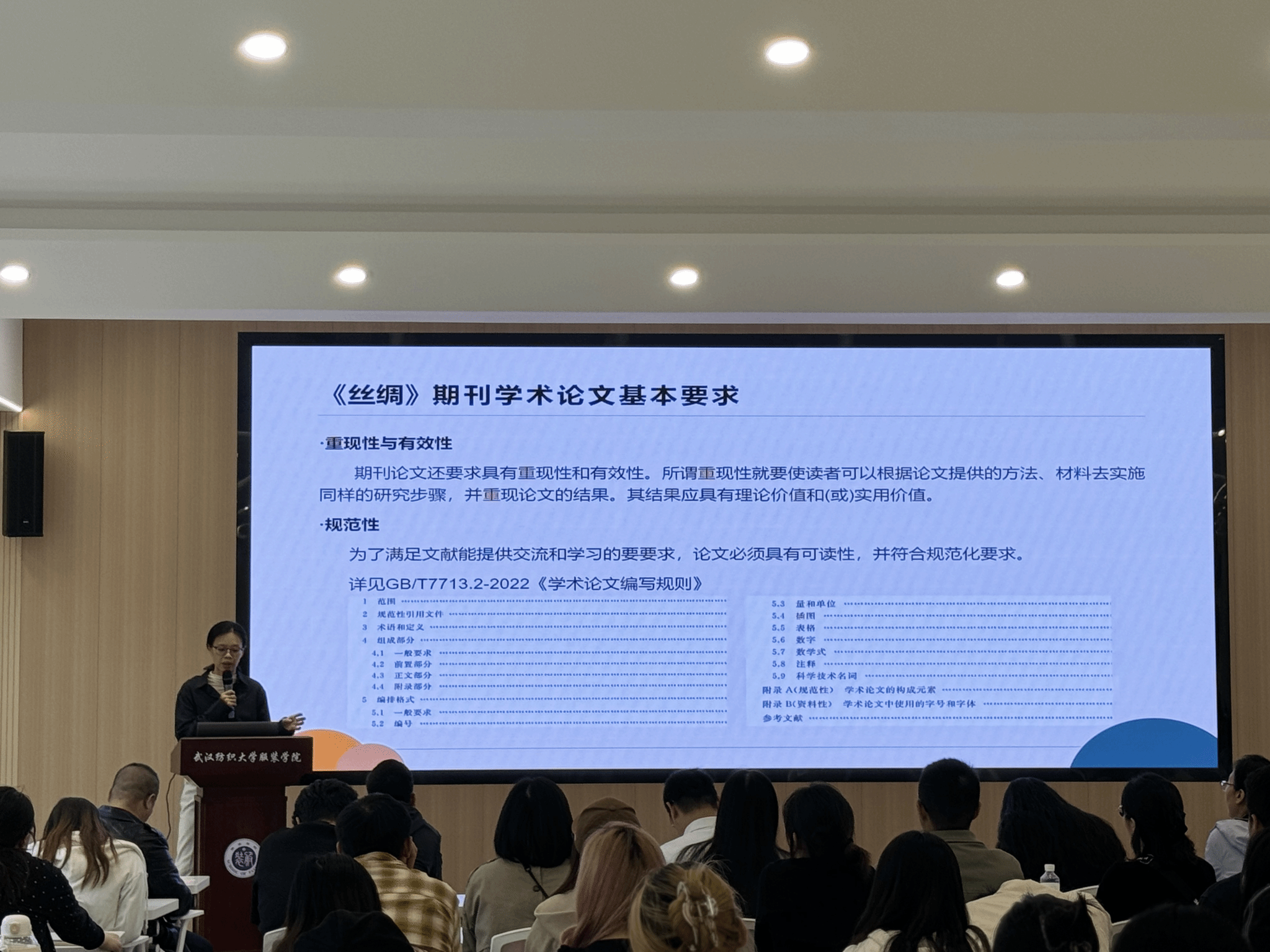 《丝绸》杂志副主编杨一舟老师从编辑的角度,以《丝绸》杂志为例,介绍了期刊学术论文的写作与选题,从期刊学术论文的基本知识,期刊学术论文写作的一般方法与要领,《丝绸》期刊的选题方向,投稿时的注意事项与常见问题对论文的写作与选题进行了深入的剖析。她认为论文需要注重科学性、创新性、逻辑性、重现性与有效性以及规范性;高水平论文没有捷径,需要多阅读文献。