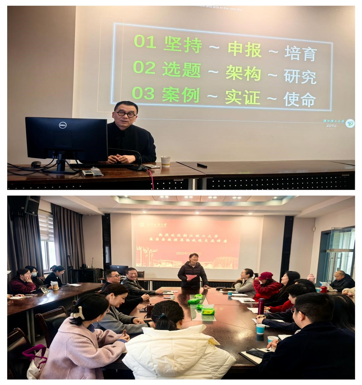 崔教授在讲座伊始时强调了学术研究和项目申报中“坚持”的重要性。他指出,坚持是积累,能提升学术敏锐度和学术影响力。选题作为学术研究的核心环节,崔教授也给出了深刻的见解。他认为选题要注重立足学科,思考设计的内涵与价值,选题要有新的内涵。在新时期,社科艺术类学术研究需要更加注重跨学科融合,将艺术学与社会科学、自然科学等多个领域相结合,探索新的研究路径和方法。同时,选题还需要紧密关注社会热点和实际需求,以解决现实问题为导向,推动学术研究与实践应用的深度融合。崔荣荣教授通过案例分析,深入浅出地解析了如何从实践中提炼出有价值的学术问题,并将其转化为具有竞争力的研究课题。他的讲解不仅拓宽了大家的视野,也为学院的老师们提供了宝贵的指导。