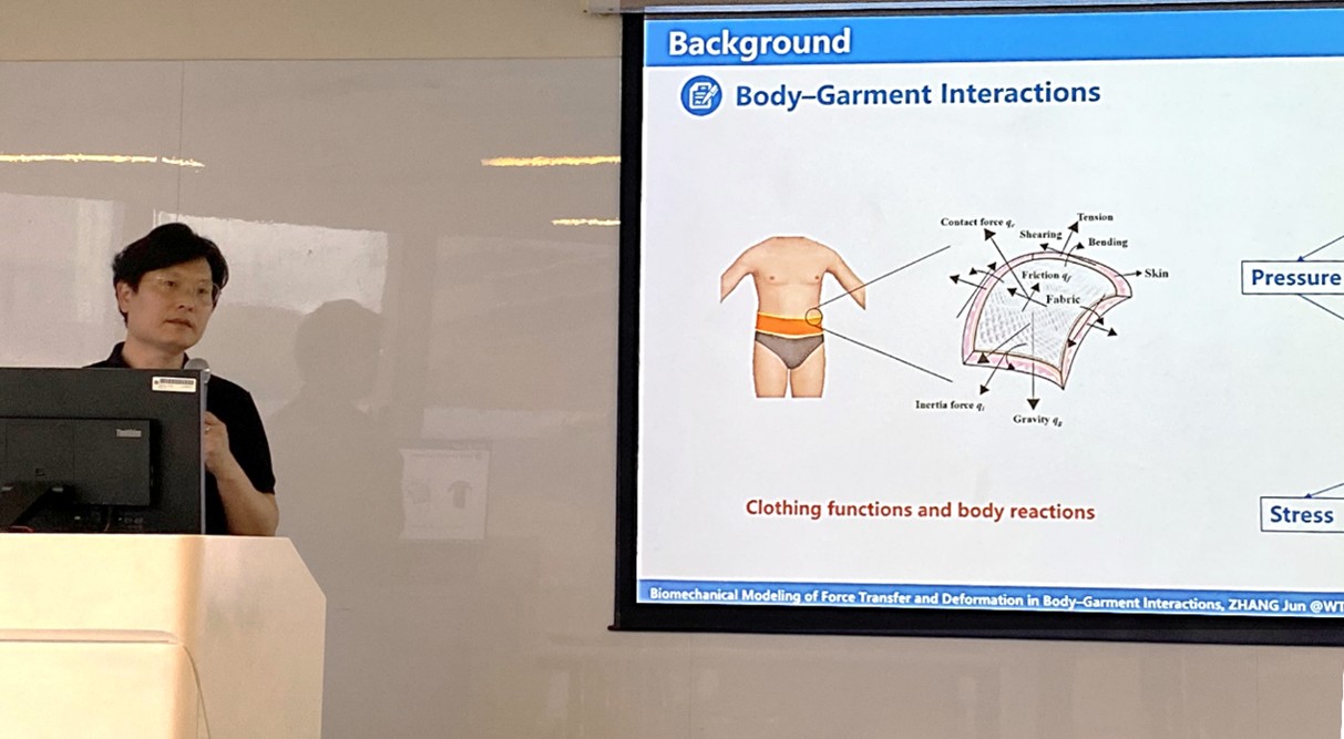 张俊博士作题为《Biomechanical Modeling of Force Transfer and Deformation in Body-Garment Interactions》的学术报告,讨论了服装与人体之间的交互作用,介绍了生物力学建模方法论以及在服装压力测量、人体变形确定和材料性能测量等方面的多维实验方法,及其在功能产品开发、运动、医疗和康复中的应用。