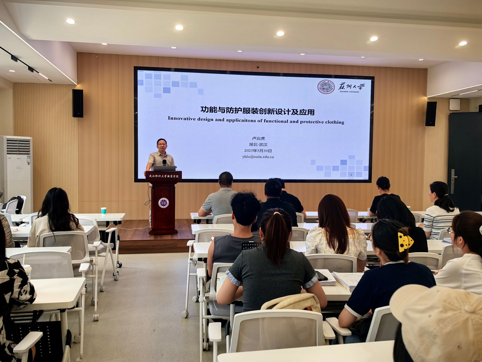 卢业虎教授是功能与防护服装领域的知名专家,长期致力于智能服装、防护性能评估、热湿传递模拟等方向的研究,成果丰硕、影响广泛。在此次讲座中,卢教授系统介绍了其团队在智能服装开发方面的最新研究进展,深入阐述了如何通过技术手段提升服装的功能性与舒适性,特别是在穿着工效、环境适应性等方面的创新实践。他还重点分享了在防护服装研发过程中的经验与思考,强调人体工效学在设计中的核心价值,并展望了该领域未来的发展趋势。