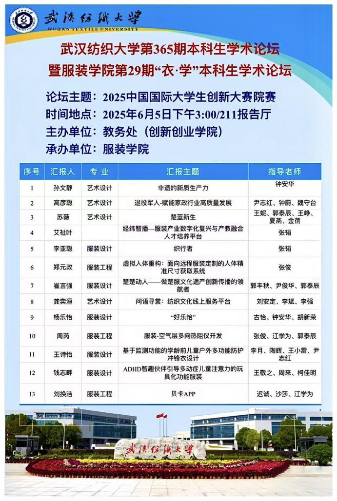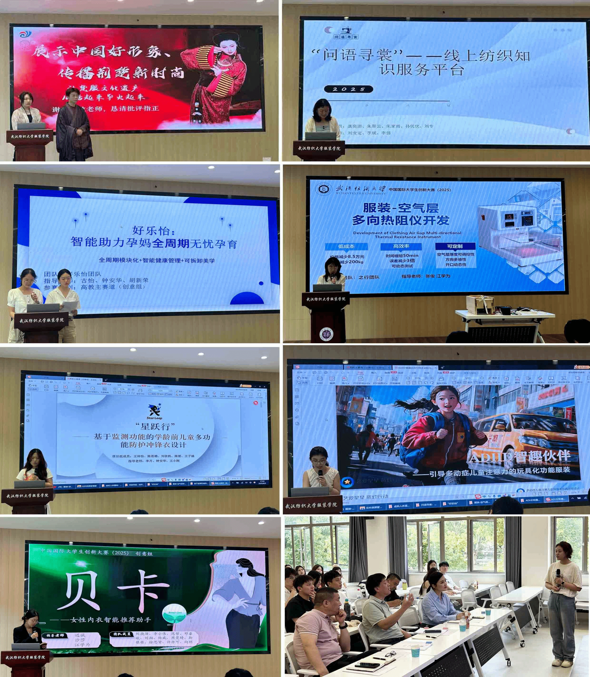 崔言强在《楚楚动人——做楚服文化遗产创新传播的领航者》汇报了团队致力于楚服文化遗产的创新传播与传承,为传统文化数字化传承的具体实践。龚奕洹在《问语寻裳:纺织文化线上服务平台》中提到运用VR/AR技术打造沉浸式学习体验,吸引大众关注传统纺织文化的实践。杨乐怡讲述了针对孕妇在生产全周期中遇到的产品使用的痛点难点,成立“好乐怡”孕妇群体全周期的智能穿戴服的项目初衷。周芮在《服装-空气层多向热阻仪开发》中针对传统热传递测试设备难以模拟复杂热传递的情况,通过软硬件融合,可实现空气层多向热阻测定与热传递动态模拟测试。王诗怡在《基于监测功能的学龄前儿童户外多功能防护冲锋衣设计》中针对学龄前儿童户外安全这一痛点,设计具备实时监测、落水自动救助功能的户外防溺水、防走失冲锋衣。钱志畔在《ADHD智趣伙伴引导多动症儿童注意力的玩具化功能服装》中提出针对多动症儿童设计的智趣性服装项目。刘换洁在《贝卡APP》中为提升女性健康消费体验,研发的基于LSTM神经网络的智能胸罩推荐平台的创新实践。