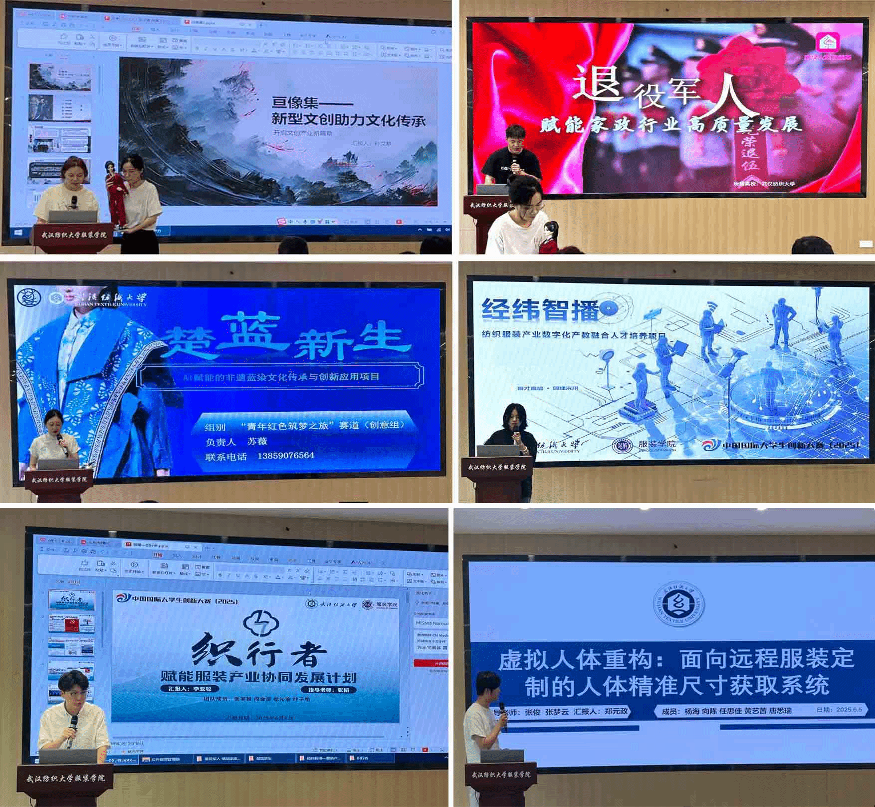 孙文静汇报了《非遗的新质生产力》中将文物故事融入产品设计,通过“文物IP+非遗工艺+BJD潮玩”三位一体模式,实现文创、BJD、非遗三大市场的三栖用户转化,开辟传统文化活态传承新路径。高彦聪在《火烈鸟管家——退役军人赋能家政行业高质量发展》中汇报了退伍军人的纪律性、执行力、专业性与家政服务结合,对打造高标准、高效能、高品质的家政服务新模式的有效实践。苏薇在《楚蓝新生》中汇报了原创草木染服饰品牌纺大染语,以传统植物染色技艺研发环保性与独特性产品的案例。艾祉叶在《经纬智播—服装产业数字化复兴与产教融合人才培养平台》中希翼通过产教融合平台对服装人才综合素养的提升,为解决大学生就业做出积极的探索。李亚聪在《织行者-赋能纺织服装产业发展计划》汇报了团队以产教融合,创新驱动为核心,为实现纺大智造赋能荆楚的具体实践。郑元政以《虚拟人体重构:面向远程服装定制的人体精准尺寸获取系统》利用深度学习算法和先进传感器,重建高精度人体模型,打破时间和空间限制,满足个性化需求,为行业发展注入新活力。