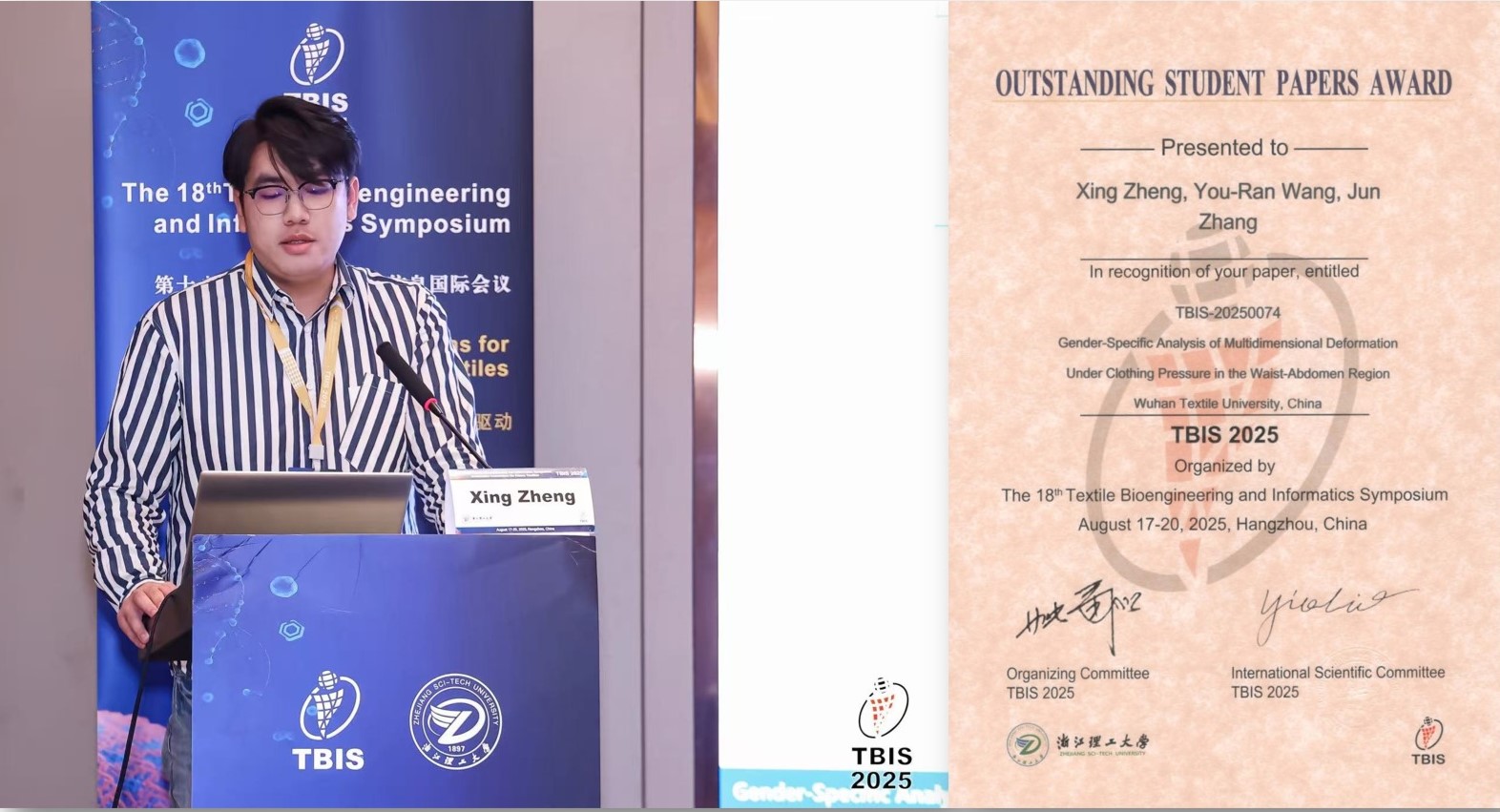 研究生郑兴(指导教师张俊博士)作报告“Gender-Specific Analysis of Multidimensional Deformation Under Clothing Pressure in the Waist-Abdomen Region”,在“Fashion Design: Simulation and Generative Modeling Technologies”分会场中分享了团队在服装压力作用下人体腰腹部多维变形特征性别差异方面的研究成果。郑兴同学的论文在200余篇参会论文中脱颖而出,以评分第二荣获十篇“优秀论文奖”之一。