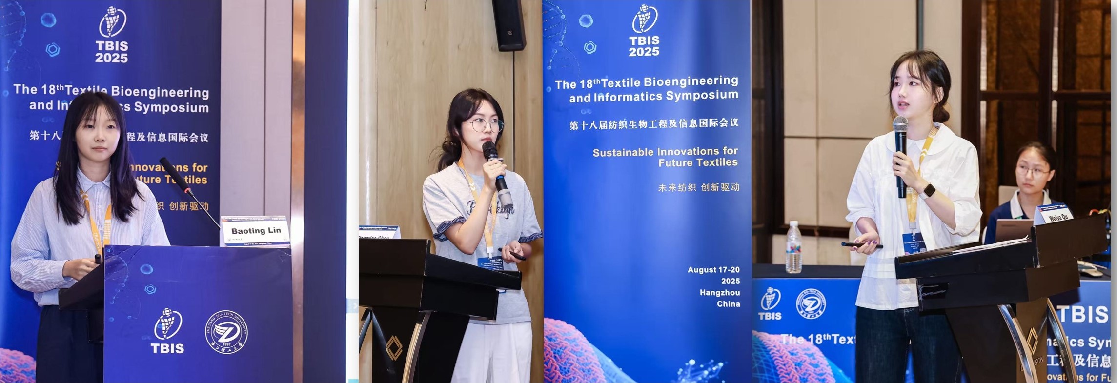 研究生林保宝婷(指导教师陶辉教授)作报告“Advancements in Inclusive Product Design for the Silver-Age Fashion Group”,在“Digital Technologies Empower Healthy Living: Intelligent Digital Homes; Biological Detection and Intelligent Information Systems”分会场介绍了团队在面向老年人群的包容性时尚产品设计方面的创新探索;研究生陈苗苗(指导教师江学为博士)作报告“Impact of Knee Orthosis Structure on Running Performance”,在“Clothing Comfort and Protective Equipment”分会场中探讨了膝关节支具结构设计对跑步性能的影响;研究生屈微雅(指导教师张俊博士)在同一分会场上作报告“Evaluation of Moisture Comfort of Fabric with Different Moisture Contents”,分享了其关于不同含湿率织物湿感舒适性的评价研究。