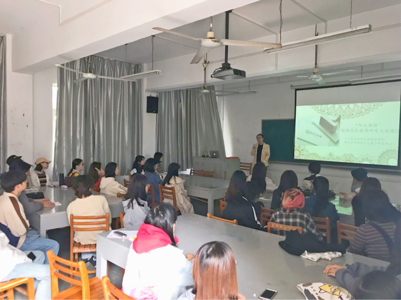 讲座以“纺大染语”植物染色服饰研发大创团队为例。为同学们讲述了荆楚纺织类非遗的概况,让同学们认识到挖掘中国传统文化是未来中国设计师重要的发展方向。接着展示了纺大染语团队近几年在传统印染技艺传承与保护中所取得的阶段性成果。