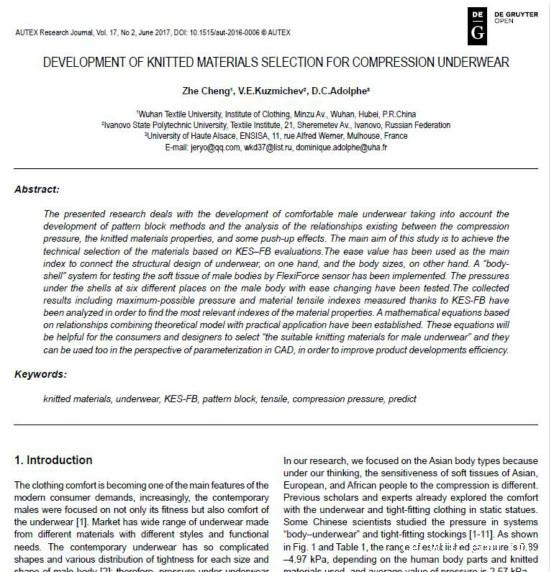 青年教师程哲作为第一作者,我校为第一研究单位,与通讯作者纺织服装专家库茨米切夫•维克多院士,在国际工程技术与纺织材料科学领域公认的SCI权威期刊:《Autex Research Journal》(The Journal of Association of Universities for Textiles),公开发表了学术论文“Development of knitted materials selection for compression underwear”,由德国著名学术出版社De Gruyter出版发行,论文全英文11页,重点研究在了针织面料性能与内衣设计之间的参数分配问题。