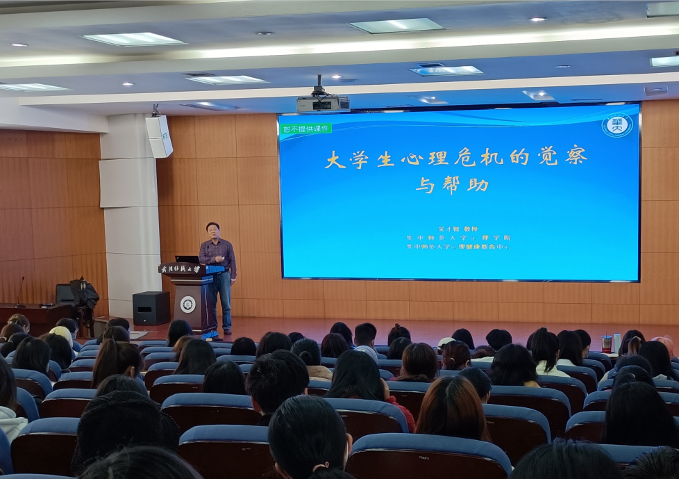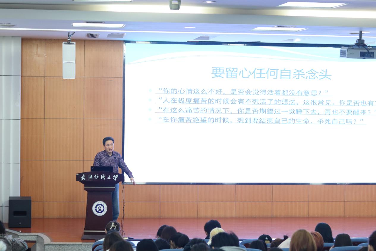 承办的第223期阳光人文讲坛在南湖校区主楼T201举办。此次讲座特邀请华中师范大学心理学院教授、华中师范大学心理健康教育中心常务副主任,湖北省青少年心理健康教育中心副主任吴才智为同学们带来了一场主题为“大学生心理危机的觉察与帮助”的专题报告。南湖校区辅导员,各班心理委员、寝室长等三百多人参加了讲座。