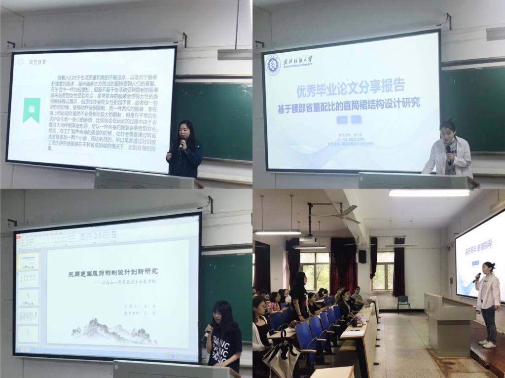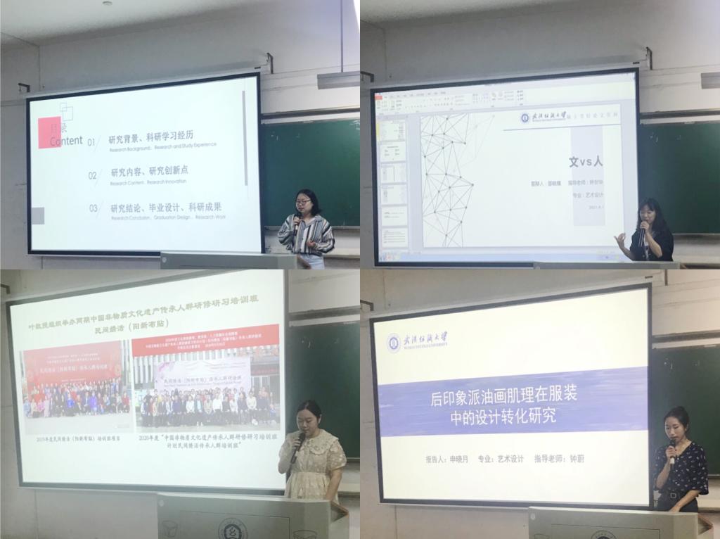 康鑫元同学以“归拔工艺分析及其在无省合体服装设计中的应用研究”为题,通过人体分析,找到适合无省合体服装的结构版型设计,配合归拔工艺来达到需要的实验版型。张雪同学以“基于腰部省量配比的直筒裙结构设计研究”为题,她的研究基于智能制造以及服装个性化智能定制背景,针对个性化直筒裙腰省量结构设计,通过数据采集和因子提取,获得青年女性腰部形态细分及其对应的腰省量配比,并建立青年女性腰部形态特征判别模型,在为数字化人体模型库提供参数依据的同时,也为个性化直筒裙腰省结构设计提供理论参考依据。蔡虹作了题为“东周楚国服饰形制设计创新研究——以马山一号楚墓出土女装为例”的发言,她以东周楚国服饰为研究对象,并在结合文献、图像与实物的基础上,着重对湖北荆州马山楚墓出土服饰进行研究。赵艾茜同学汇报题目为“现代服装设计中道家美学风格研究”,她首先从自己的科研学习经历开始分享,讲述自己在参与导师科研项目的过程中确立了研究方向、同时结合课程学习和项目实践,申请研究生创新基金项目的经验。然后,她对毕业论文的内容进行详细地介绍,同时还展示自己研究生阶段的科研成果。邵晓煊的研究题目为“可持续的多功能母子装设计与应用”,此文章针对母子装以可持续的多功能设计理念为原则,从多功能需求着手,以结构功能为主要设计点,并结合情感功能与心理功能两个设计点展开研究。昌仪琳的论文题目是“阳新布贴传统纹样在家居亲子装中的设计应用”,她首先分享了参加导师的国家级科研项目,并依据科研项目确定了论文选题,对毕业论文研究内容与成果进行了详细介绍。申晓月同学汇报的题目为“后印象派油画肌理在服装中的设计转化研究”,在研究中她将一个通俗的、习以为常的话题层层剖析做细,探析服装与肌理之间的关联性,在纯绘画艺术与设计艺术之间寻找设计转化的平衡点和审美的统一性。