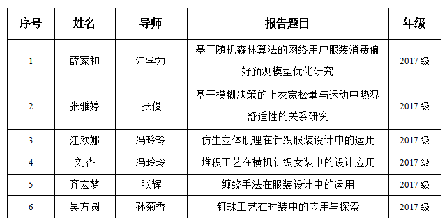 本次论坛旨在鼓励服装设计与工程专业本科生要善于利用人工智能、大数据等新兴学科知识解决服装工程问题,激发学生自主学习的兴趣。论坛第一期以服装工程技术为主,邀请了薛家和、张雅婷、江欢娜、刘杏、齐宏梦、吴方圆等六位论文答辩取得优异成绩的本科毕业生,他们分别汇报了自己的课题,并与大家分享了学习心得。