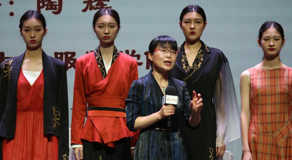 表演班15位同学身着学院非遗研究中心和学生设计的服装作品上台进行展示,台下响起热烈的掌声。陶院长依次讲解每件作品背后的文化内涵,她指出,百合小说