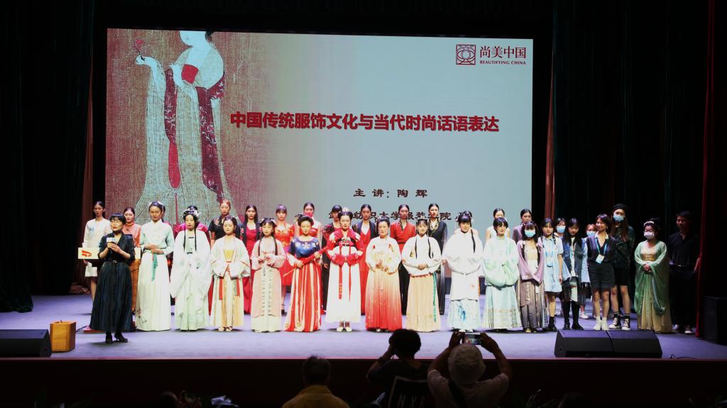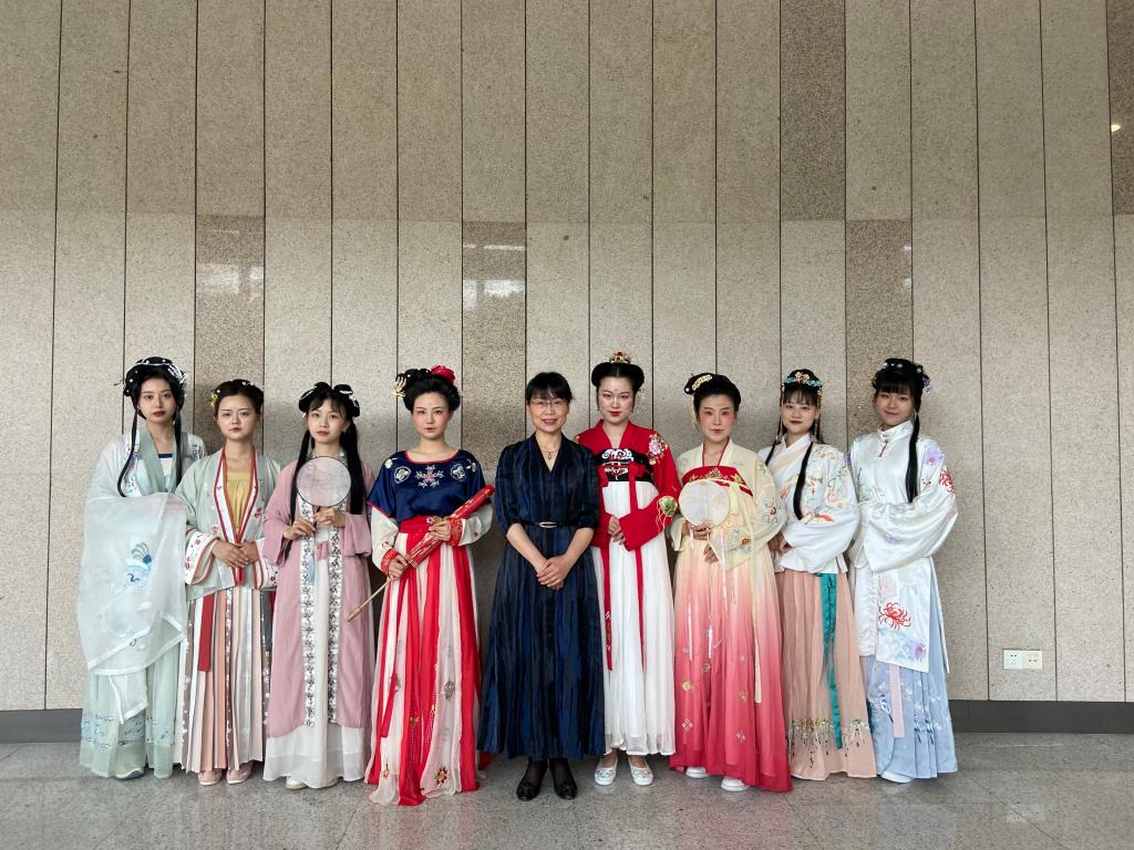 八位研究生同学身着别致汉服上台展示,陶院长依次讲解每件汉服背后隐藏的中华文化。