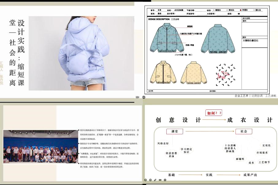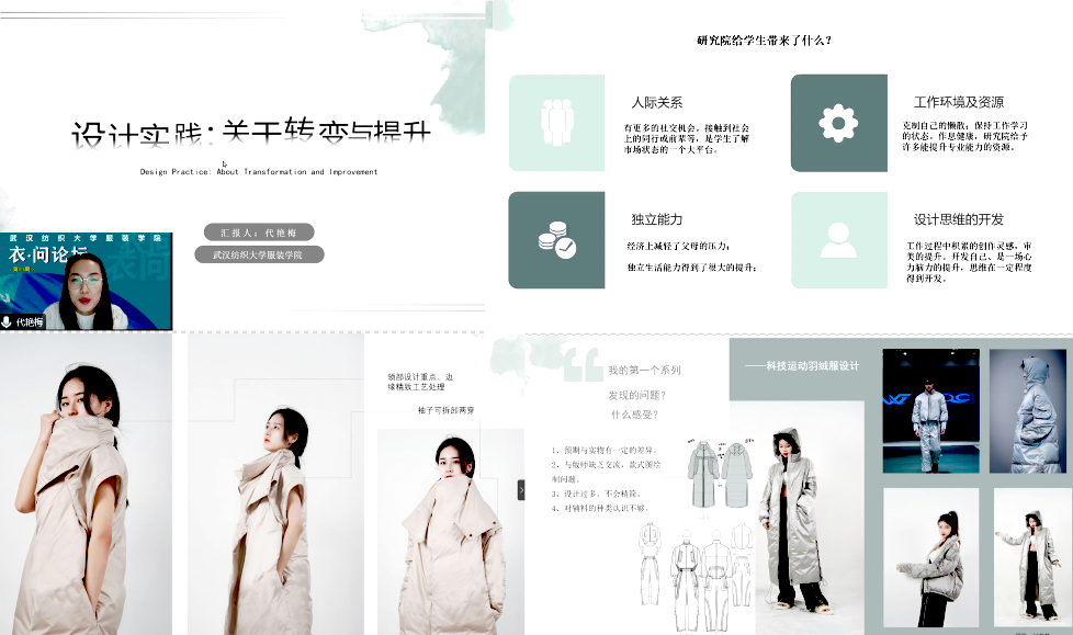 代艳梅在《设计实践:关于转变与提升》中以个人系列作品为案例分享自己在设计中的思维变化。色彩、款式、面料、工艺等都要为设计主题服务;考虑预期产品适穿性及商业价值——关注市场。有效利用研究院的设备资源进行设计。实习中,最重要的是积累了专业经验和就业规划。而能力提升是通过不断的自我建立与否定。在研究院实习锻炼了自己的团队协作能力、沟通能力、专业技能、关注行业动态的意识等。