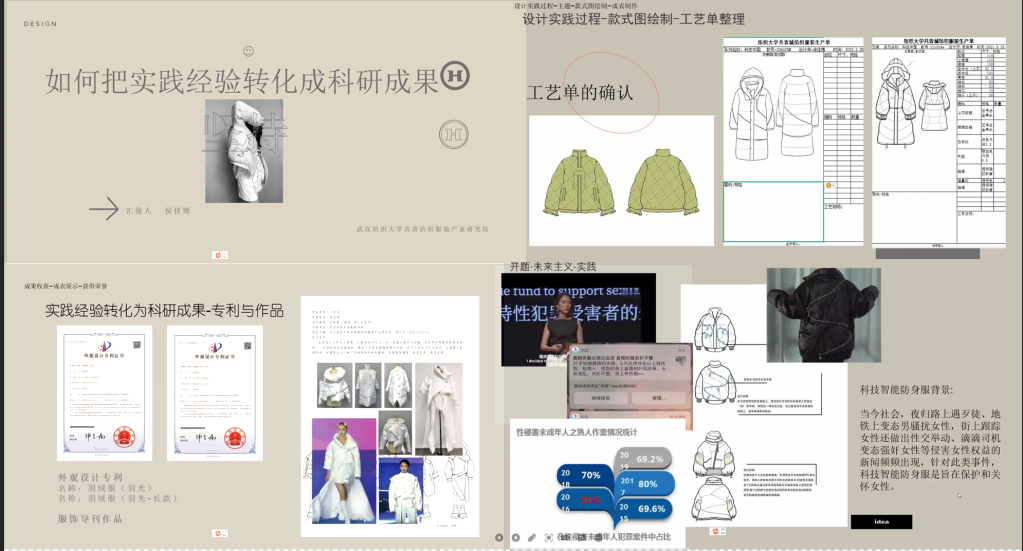 侯佳博此次汇报主题为《关于如何把实践经验转化成科研成果》从在研究院的实践内容到科研成果的转换,将设计作品快速转换为论文,专利、参赛作品、发布会形式等产出方式,即使是每一个研究生最为头疼的开题环节,实践中提炼主题,开题方向和作业设计在实践中融会贯通,一脉相承。