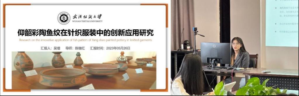 吴增以《仰韶彩陶鱼纹在针织服装中的创新应用研究》为题重点探析创新鱼纹图案在系列针织服装中的创新应用研究。深入探索仰韶彩陶鱼纹的发展现状、起源演变、表现形式、艺术特征和文化内涵等内容,采用现代形式美法则、构图要素和构成方法去分析仰韶彩陶鱼纹所呈现的艺术特征,通过对关键要素的提取、分解和重组,以服装设计学和视觉美学为基础,以仰韶彩陶鱼纹图案中的构图、色彩、文化和造型等艺术语言为基调,创新仰韶彩陶鱼纹图案,采用不同的工艺手法去进行实践探索,选择针织工艺技法制作出具有鱼纹图案的针织服装作品,赋予针织服装独特的文化内涵。