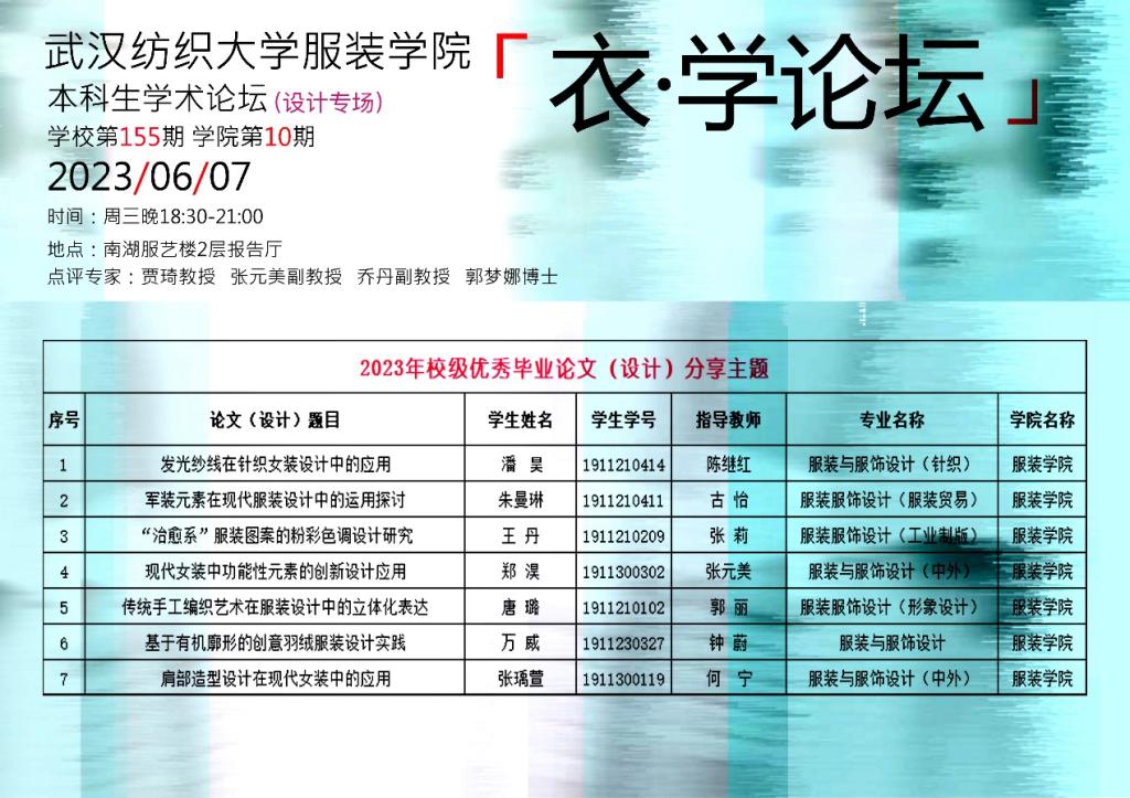 郑淏以《现代女装中功能性元素的创新设计应用》为题分享了对不同性质功能性设计的应用创新进展,梳理了功能性元素设计方法并在毕业设计中进行创新性实践。唐璐以《传统手工编织艺术在服装设计中的立体化表达》为题进行分享,将传统手工编织应用在毕业设计中,实践其在服装设计中的运用。万威以《基于有机廓形的创意羽绒服装设计实践》为题介绍了羽绒服装的设计原理,探讨有机廓形在羽绒服装设计中的实践价值。张瑀萱就《肩部造型设计在现代女装中的应用》从理论结合设计实践探讨了肩部造型设计提升作品多样创意性途径。