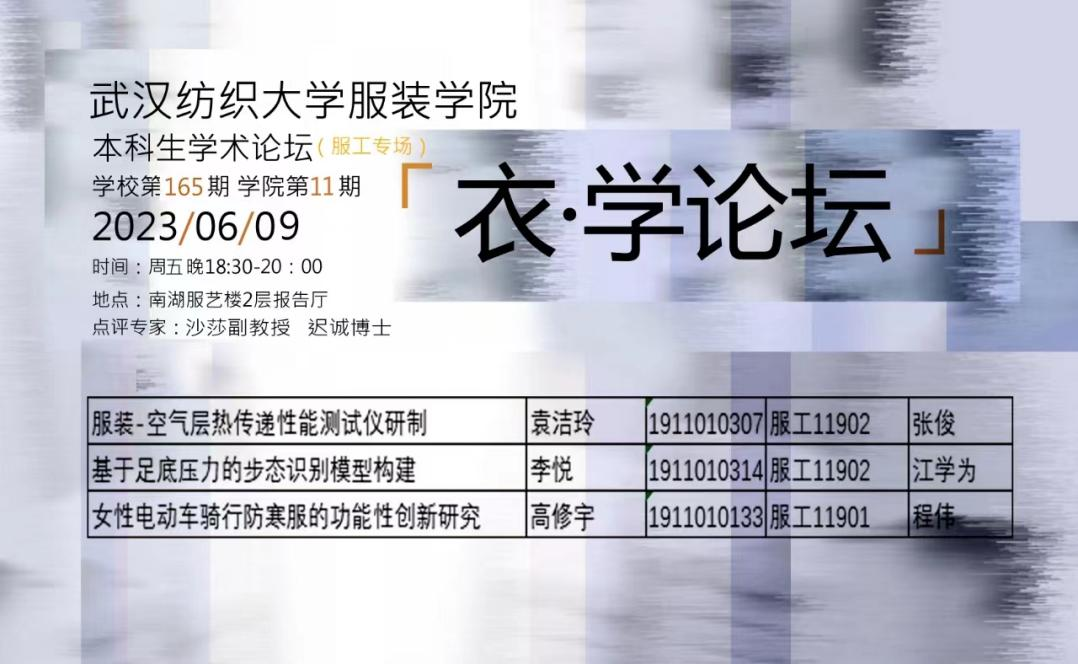精彩的论坛持续了近两个小时,三位同学围绕自己的毕业课题以及考研等情况进行了分享和交流。现场反响热烈,提问互动积极,鼓励低年级同学重视基础课程的学习,多参加学校学院组织的各类学科竞赛,为毕业论文及后续研究打好基础。沙莎副教授和迟诚博士分别从人体工程、大数据分析、国内外前沿等角度给每位同学以专业点评,对高品质论文给予肯定。江学院副院长鼓励大家积极参加各类学科竞赛,在专业实践中成长。钟蔚教授鼓励同学们要利用我校纺织服装特色,以“新工科”建设为契机,秉承“艺科思融合”理念,积极探索学科融合,借“问题意识”负“社会担当”,以高度的社会责任感与使命感,做有情感、有温度的课题设计。