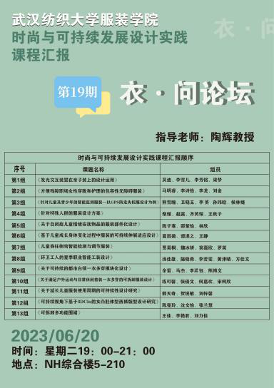 主办的第十九期“衣·问”论坛在尚知楼210教室举行。本次活动围绕着研究生特色课程“时尚与可持续发展设计实践”课程结课汇报展开。论坛由百合小说
