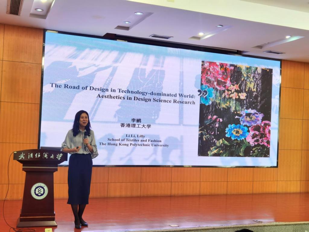 的师生。李鹂教授围绕艺术设计与科学技术的交叉融合,从时尚产品设计、科学研究和产业化应用等方面介绍了她及所在团队的科研经历及丰富的科研成果,展示了艺术设计与科学技术交叉融合在科学研究中的重要意义。