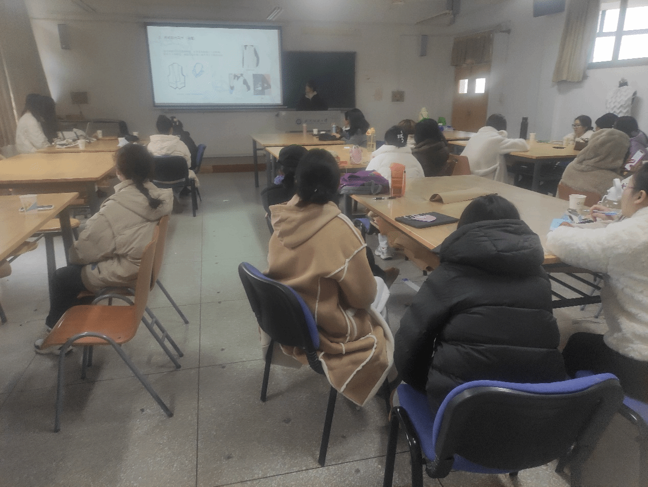 郑迎春同学以《羽绒服中的结构创新设计与应用研究》为题,围绕青果领理论与实践研究、设计实践案例、毕业系列设计实践、成果转化方面进行了分享。阐述了将青果领独特的结构和处理工艺,结合羽绒服的版型和工艺进行交叉视角的研究。重点分析了不同领型的结构特点和结构处理方法,并展示了青果领及其变形结构在羽绒服中的具体应用案例,丰富了同学们对于青果领的认识,为服装设计带来了启迪。