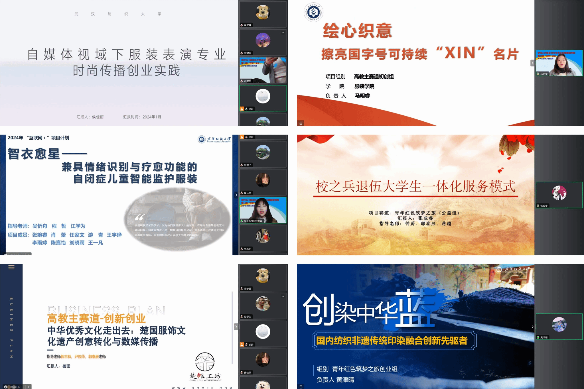侯佳丽在《自媒体视域下服装表演专业时尚传播方向创业实践》则站在时尚传播角度助力美丽乡村建设。张婉睿在《智衣愈星:兼具情绪识别与疗愈功能的自闭症儿童智能监护服装》中以自闭症儿童生理安全问题为切入点,结合虚拟仿真技术设计智能监护服装,解决自闭症儿童服装同质化严重的问题。姜珊在《中华优秀文化走出去:楚国服饰文化遗产创意转化与数媒传播》中展示了团队近年来在楚文化活化设计方面的实践成果。马明睿在《绘心织意—擦亮国字号可持续“XIN” 名片》通过艺科思融合,数字赋能品牌升级,为国字号品牌提供系统化优化服务擦亮可持续新名片。张成睿带领退伍大学生团队组建《校之兵计划——退伍大学生一体化服务模式》站在公益和商业融合的视角为退伍大学生提供新的就业路径。黄津晴在《创染中华蓝——国内纺织非遗传统印染融合创新先驱者》中展示了团队近年来在蓝染领域所做的创业实践。
