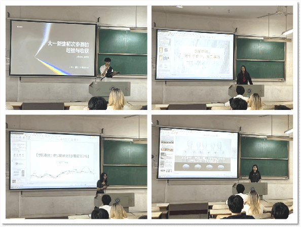张丹、张元美分别对四位同学的主题汇报进行点评,针对四位同学所处的大学不同阶段的学习历程进行进一步的启发,希望大家在每一天的时光里,踏踏实实走好专业学习的每一步,更要平时注重积累,抓住每一次参赛的机会,并尽早做好学习、就业、或考研规划,在时光中经历成长与蜕变。随后,为四位同学颁发了荣誉证书。