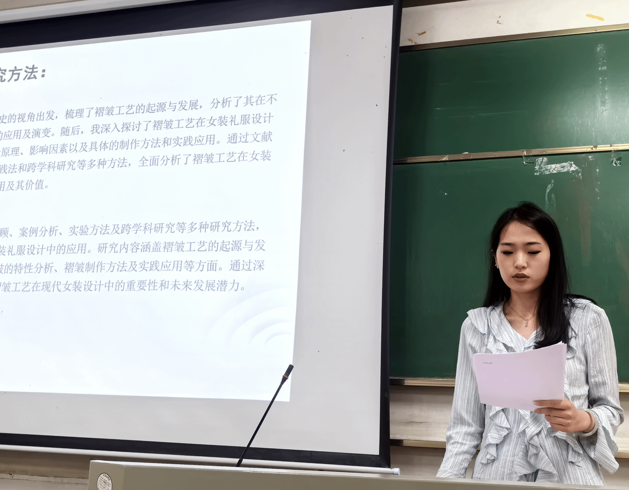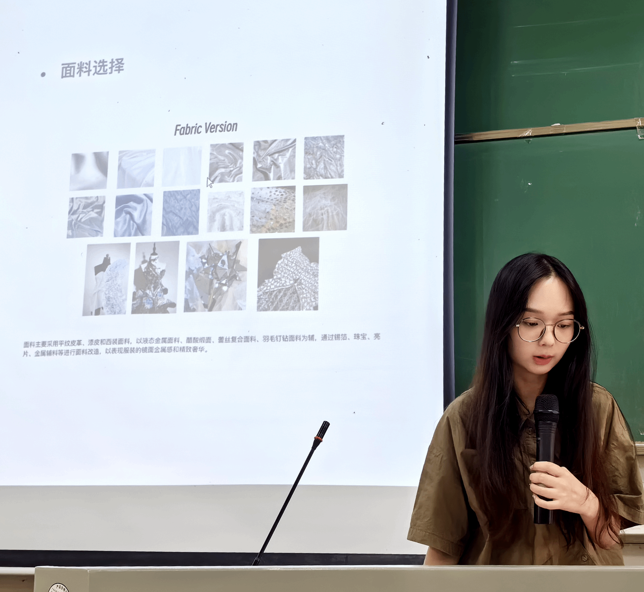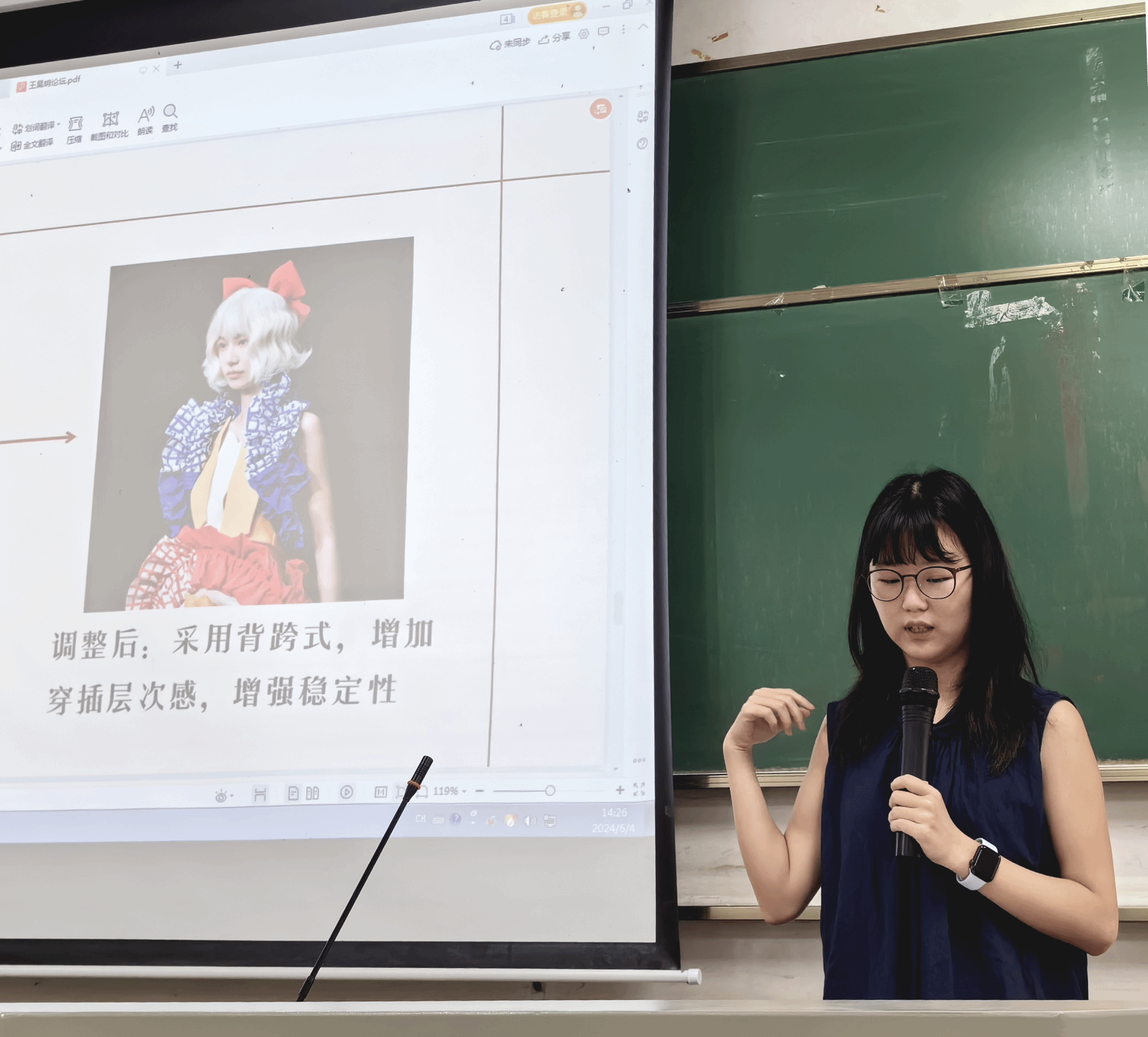 宋兆慧同学分享的优秀毕业论文题目为《复古未来主义风格在女装设计中的应用》,展现复古情怀与未来视角,创造了无尽的可能性,复古与未来两者的融合与创新使得服装风格更加个性化、多元化。王昊玥以《IP形象在现代服装设计中的应用与研究》为题进行分享,讲述她的设计构思过程和曲折,告诉低年级的同学一定要深入自己的内心发现自己喜欢的擅长,才有更大可能性做出成功的作品。张琪以《褶皱工艺在女装礼服中的创新运用》为题从服装的可穿性与审美性角度阐述了褶皱工艺的功能,并进行设计实践的过程。陈雨轩讲述了毕业设计作品《城市里的赫拉克勒斯》从灵感来源到设计制作过程中用到的新科技及非纺织材料等,大量的设计实验是成功的关键。郭嘉分享了设计作品《流浪》在设计制作过程中的经历和经验,详细的分解流行趋势与自己设计的关联。罗佳乐《Escape from the circus》三位同学的毕业设计作品服装图案的应用进行多角度的创新设计实践。