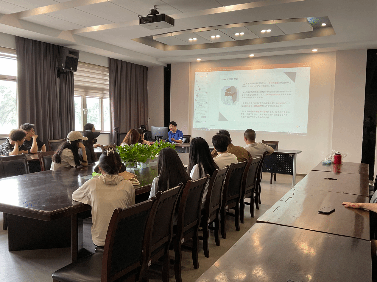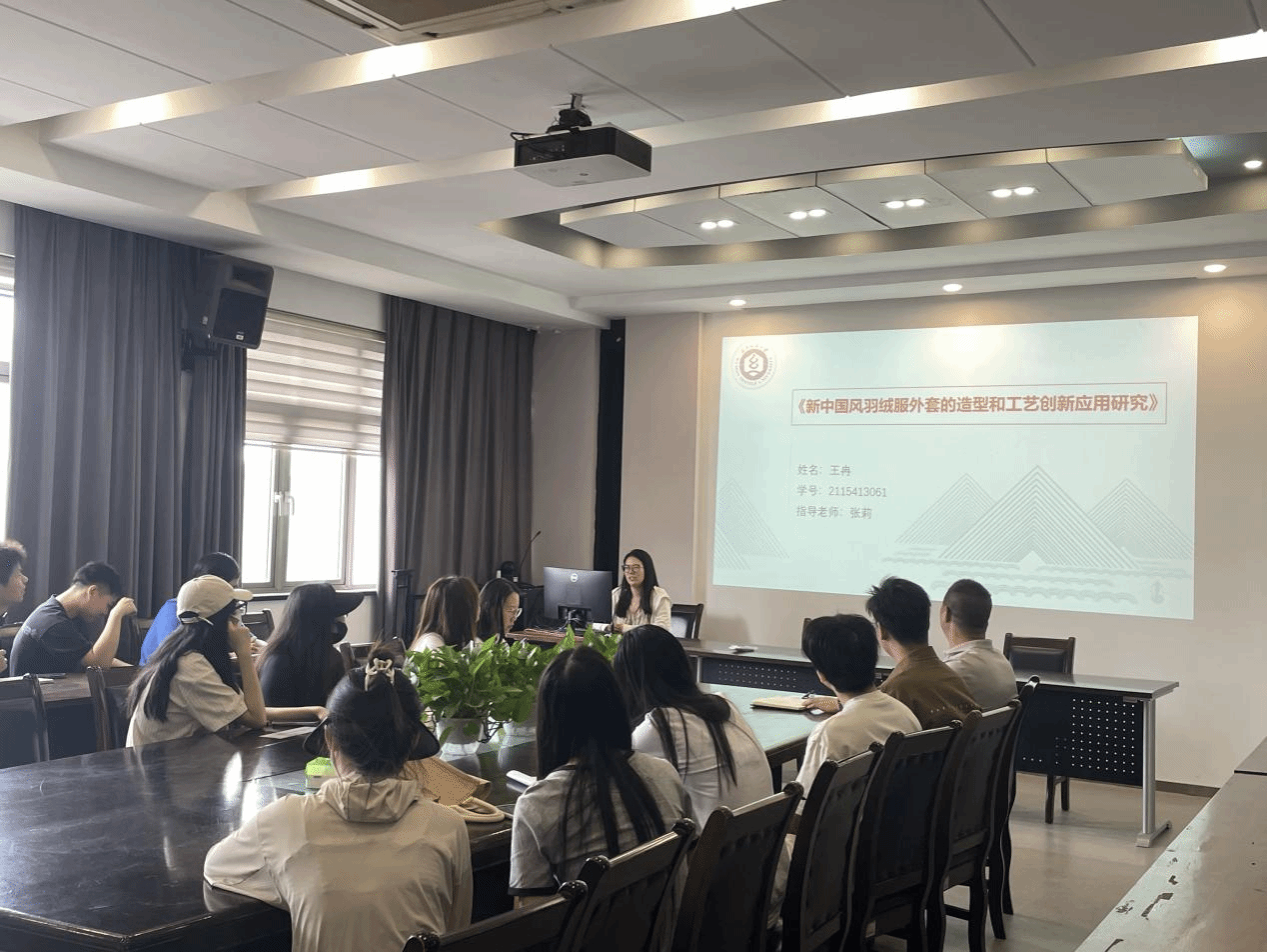 王冉同学的《新中国风羽绒外套的造型和工艺创新应用研究》,分享了关于羽绒服的造型与工艺创新心得,他通过广泛调研发现关于羽绒服装的风格设计主要集中在基于美学的款式设计,或者在理论层面,没有结合人体体型,没有考虑人体结构、服装结构及服装造型之间的关系。他针对该问题,在服装人体工程学的基础上,结合结构、工艺与产品设计对羽绒服进行了创新设计。江学为教授对王冉同学的分享给予肯定,并提到设计创新与前期市场调研、消费行为分析及人体工效学均有关联,在创新设计的过程中,应该综合考虑各因素,并且要运用科学合理的平均指标体系对作品进行评价。