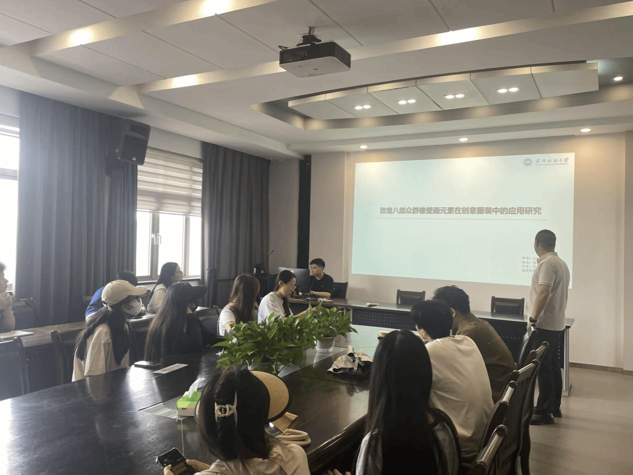 芈苏伯同学详细阐述了他的研究课题《敦煌八部众群像壁画元素在创意服装中的应用研究》。他从对八部众群像壁画深入探索,分析其发展流变及艺术特征,提取敦煌石窟中的八部众群像壁画艺术元素,并运用现代设计创意思维及相关技术软件进行创新表达,将其生动瑰丽的艺术元素以全新的生命力和表达方式运用到当代的创意服装设计中。对毕业论文的选题背景及目的、研究意义、研究框架、研究过程及内容等方面进行了全面的介绍。江学为教授对芈苏伯同学的分享给予了高度评价。他指出,艺术设计的数字化表达是艺术设计与计算机交叉融合的基础,当今艺术设计需要与科学技术进行交叉融合。