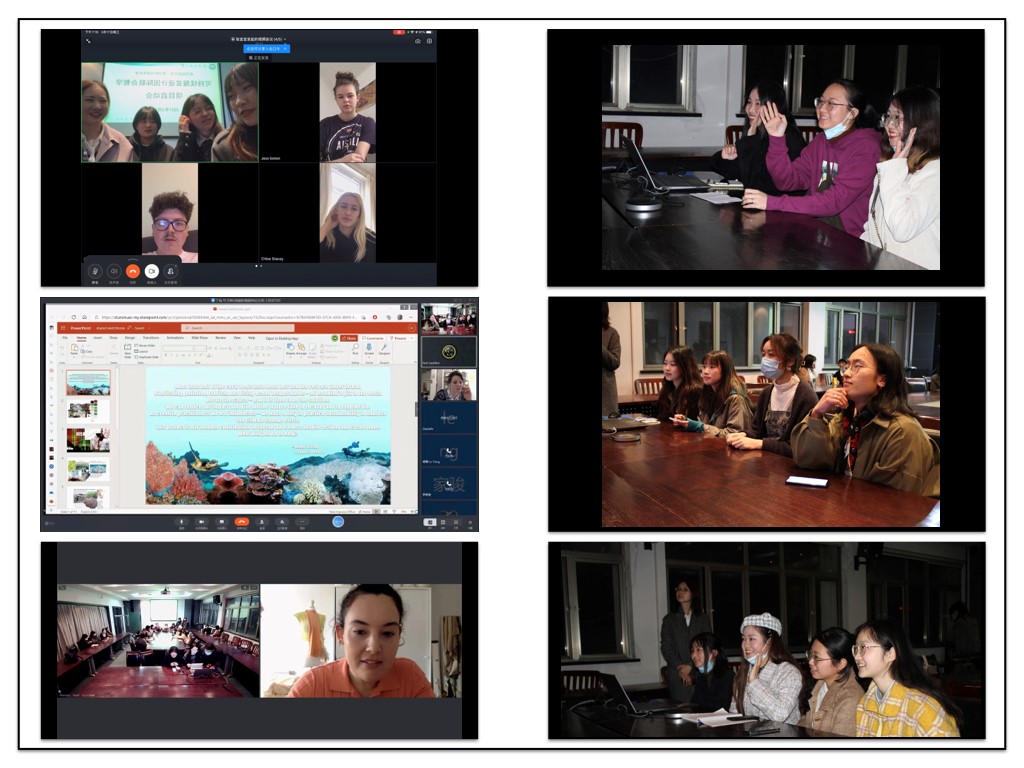 随后,中英双方的师生通过视频形式进行了课题交流和互动。八个小组也围绕“时尚可持续Rebel Tartan”这一主题分别进行了探讨和交流。该项目前期,通过学院公开招募、学生自愿报名和面试选拔,最终有32名本科生进入该项目中,与英方学生组成8个小组,每组成员由4名中方学生4名英方学生构成。由此,拉开了中英国际联合教学项目的序幕。在接下来两个月中英双方共同协作和项目推进中,将使用钉钉工作平台和微信等多种媒体形式开展中英双方学生的自由交流、集中汇报,教师的讲座与辅导等形式,最终完成系列设计作品,并在线上公开展示。