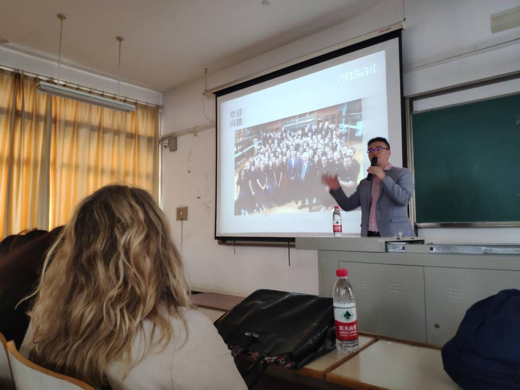与ENSAIT国际交换生项目进行了详细讲解。他通过丰富的图片,介绍了交换生项目的特色与优势,并对项目的发展前景进行了展望。ENSAIT作为培养精英工程师的专业学院,长期致力于与迪卡侬、LV等优秀公司合作教学,有助于拓宽研究生的国际视野,提高研究生的实践能力。