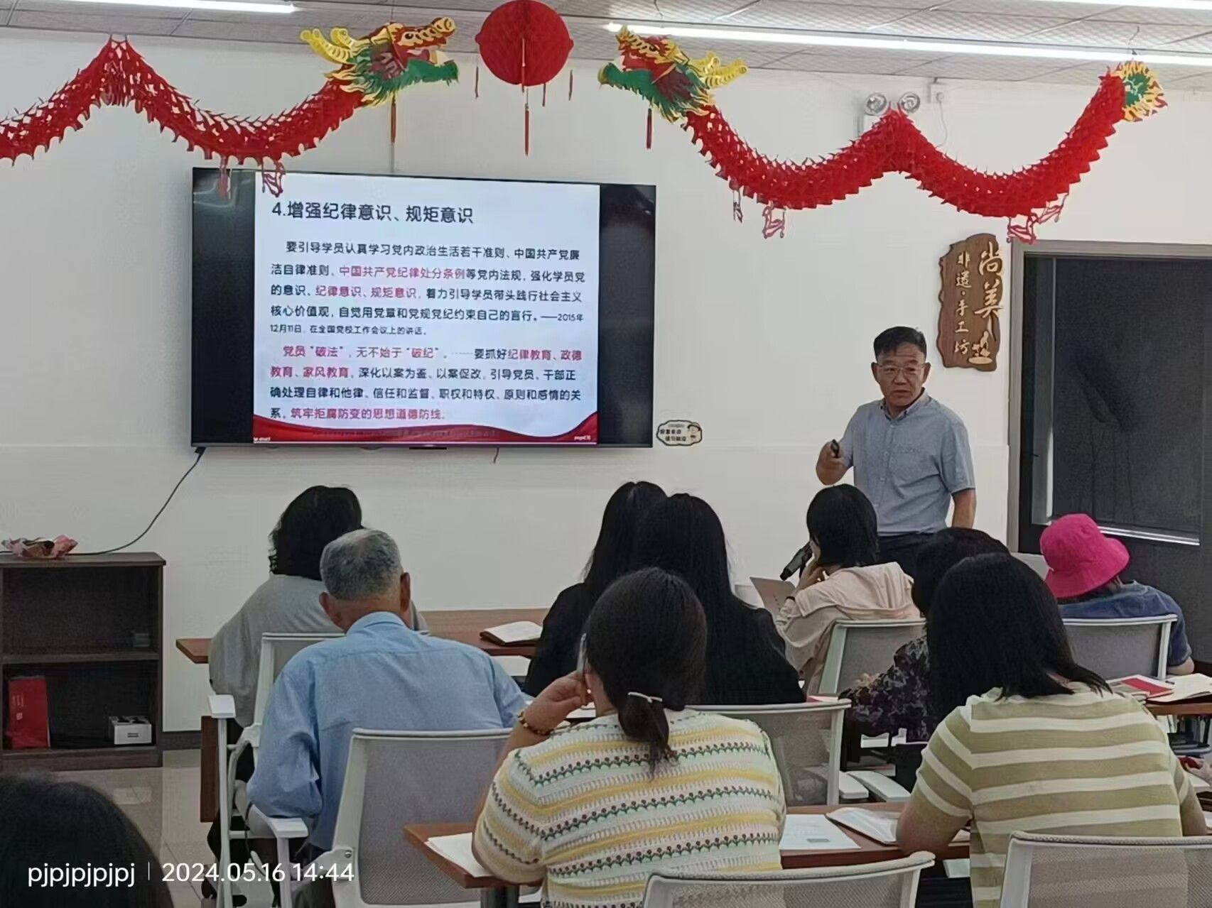 党委书记杜新年前往关山街道纺大社区讲授党课,开展党纪学习教育,纺大社区党支部书记陈君担任主持人。