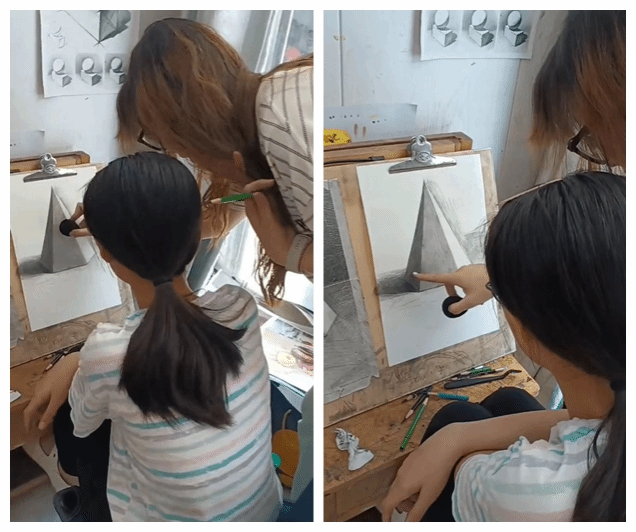(本科生支部党员陈彦君为飞扬少儿艺术中心小朋友提供素描几何辅导)