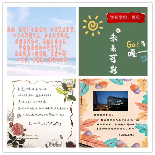学院大一至大三的同学们,纷纷拿出自己的创意巧思,或剪辑祝福小视频,或绘制祝福海报,或书写祝福小诗,以这些丰富多彩的形式向学长学姐们送上最为诚挚的祝福。