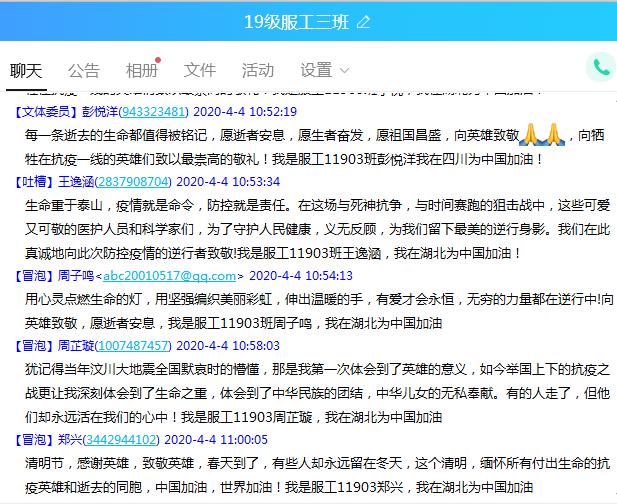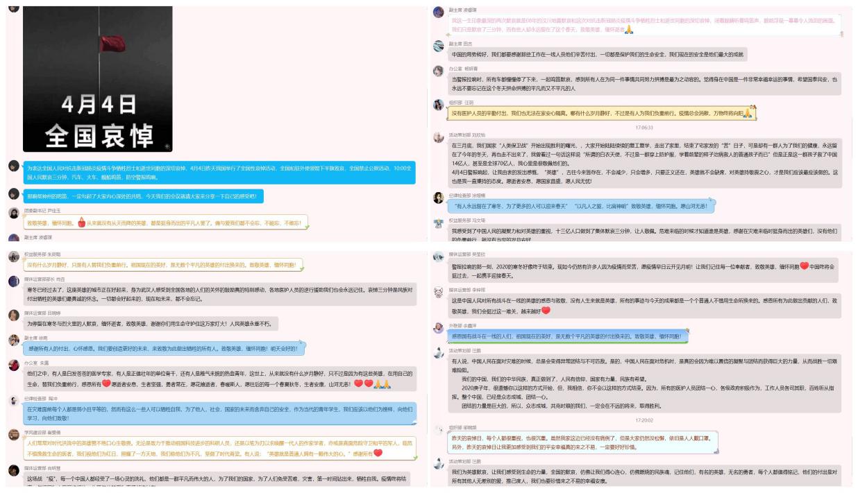 各年级辅导员老师积极谋划、组织开展主题为“缅怀先烈、致敬抗疫英雄”的云班会,通过线上观看清明节默哀视频、学习了解湖北14名新冠肺炎疫情防控一线牺牲烈士的光荣不朽事迹,缅怀先烈,向抗疫人员致敬。