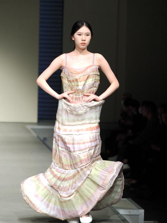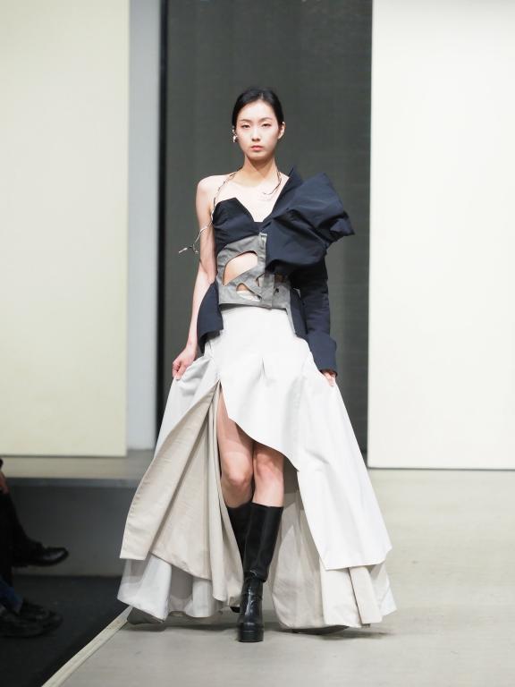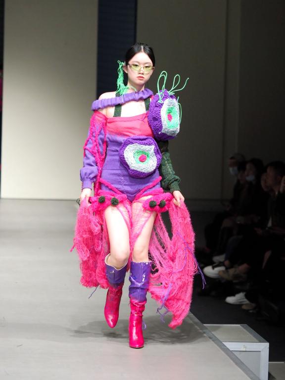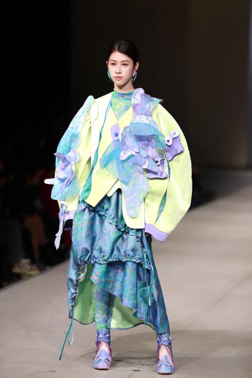 4月3日的优秀作品展,更是在前期6次毕业设计作品展优秀作品选拔的基础上,用优秀作品动态展演的方式呈现了一台集时尚和科技、智慧与创新、守正与变化、包容和开放的T台大秀。整个优秀作品展分四个篇章,分别是探索与机能、现实与现代、创造与实验、跳跃与变化。四个篇章分别通过探索的主题去感受机能对未来的思考和对可持续时尚的理解;通过文化传承和融合,用穿越的方式,梦回过去,着眼现在,展现赓续“爱+”对可持续的柔性理解;通过创意和实验的表达,感知服装时尚对现代科技的把握和推动,实验性和创造性的服装代表着未来方向的各种可能;通过服装、音乐、模特展演的编排,突出了对可持续时尚的叙事性表达。