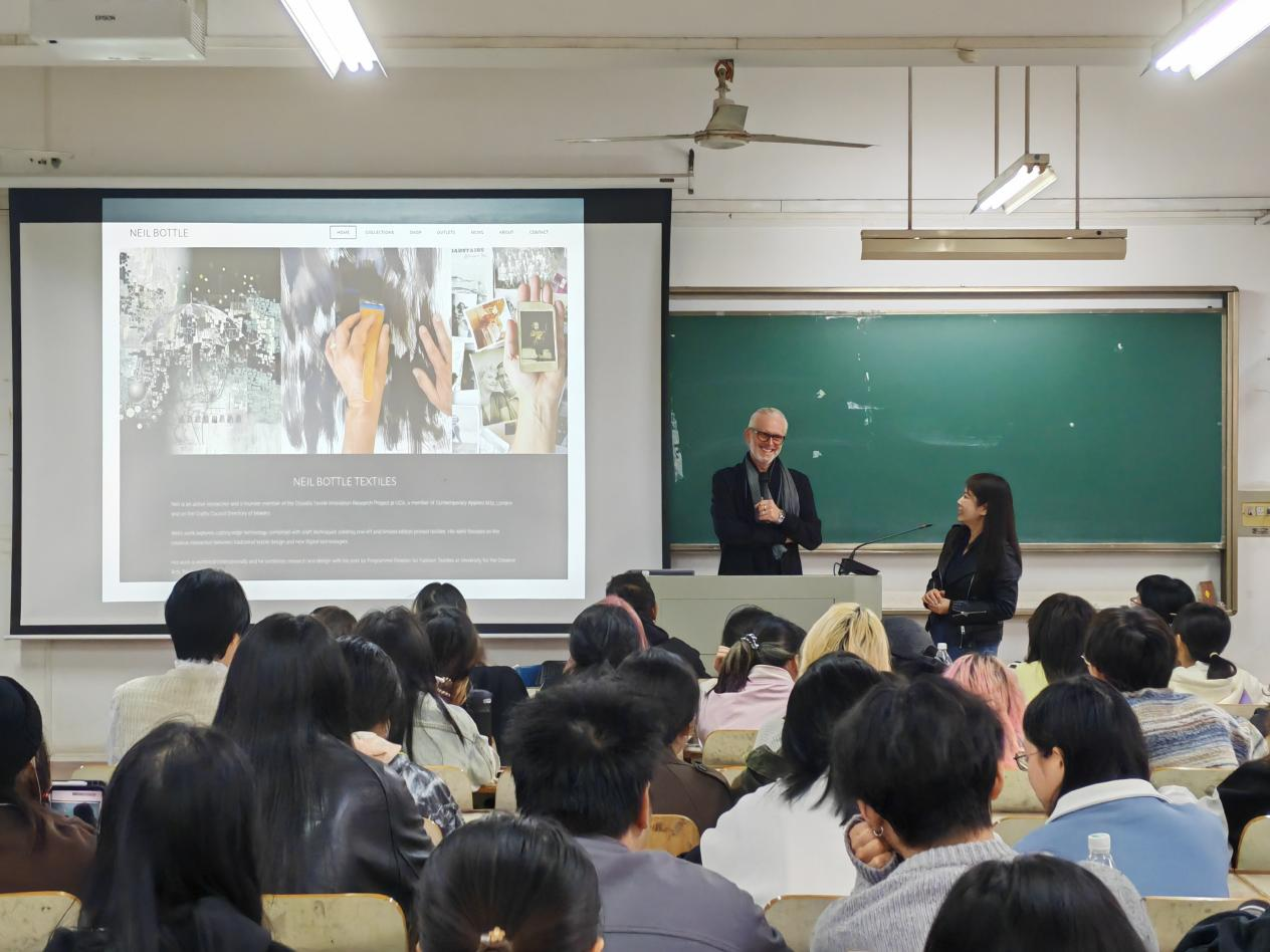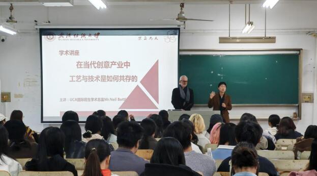 上午学术讲座中,Mr.Neil“在当代创意产业中工艺与技术是如何共存的”为主题,讲述了他毕业后参赛、创业历程分享自己的设计和工作经历,详细讲解了他的个人研究项目和学术研究方向。Mr.Neil和同学们介绍了英国伦敦创意艺术大学(UCA)的基本情况,并和现场师生交流互动,热情回答大家的提问,现场气氛热烈