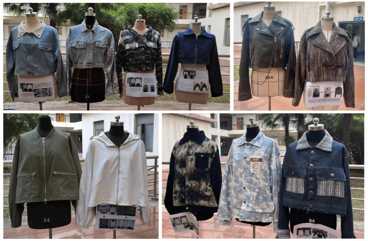 在牛仔夹克制作专题板块,学生们经过市场调研完成了牛仔外套从造型复制到拓展设计实践,从中能够清晰地分析、了解和掌握整个外套的结构工艺,同时也让学生们结合市场流行趋势,在面料拼接、版型设计以及细节工艺的处理上充分发挥了创造能力,让夹克外套的造型设计更加多样化。