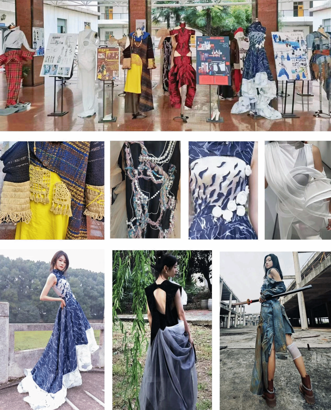 《服装专题综合设计》结课展在南湖尚知楼大厅展出。此课程是大三上学期的专业理实结合课程,共40课时,旨在加强学生综合应用服装设计原理、服装版型设计、工艺设计制作等专业知识展开设计实践的能力,同时也是学生对自我、对世界的深度认知、个性释放和综合能力提升的过程。涵盖从“设计概念确立--设计元素提取--系列服饰设计--服装工艺制作--时尚大片拍摄—展览陈列”全流程,由訚珺教授悉心指导,服设12101班全体同学独立设计制作完成。