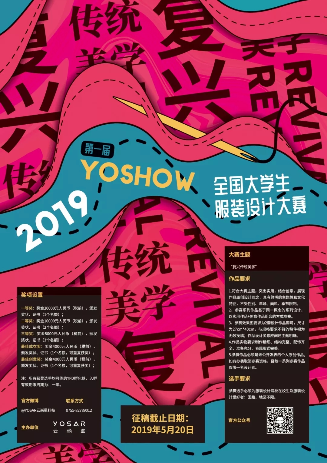 “YOSHOW全国大学生服装设计大赛”是由深圳多位原创设计师创牵头,深圳市云尚星科技有限公司主办的中国服装设计专业赛事。以服装设计专业学生为主要参与人群,涵盖中国知名院校及海外优秀院校设计人才。大赛一直秉承着发现和培养优秀的服装设计人才为宗旨,促进服装设计师的文化交流。目标打造全国青年服装设计师推介与交流平台,吸引国际与国内顶尖设计力量聚集,发展中国服装设计产业。