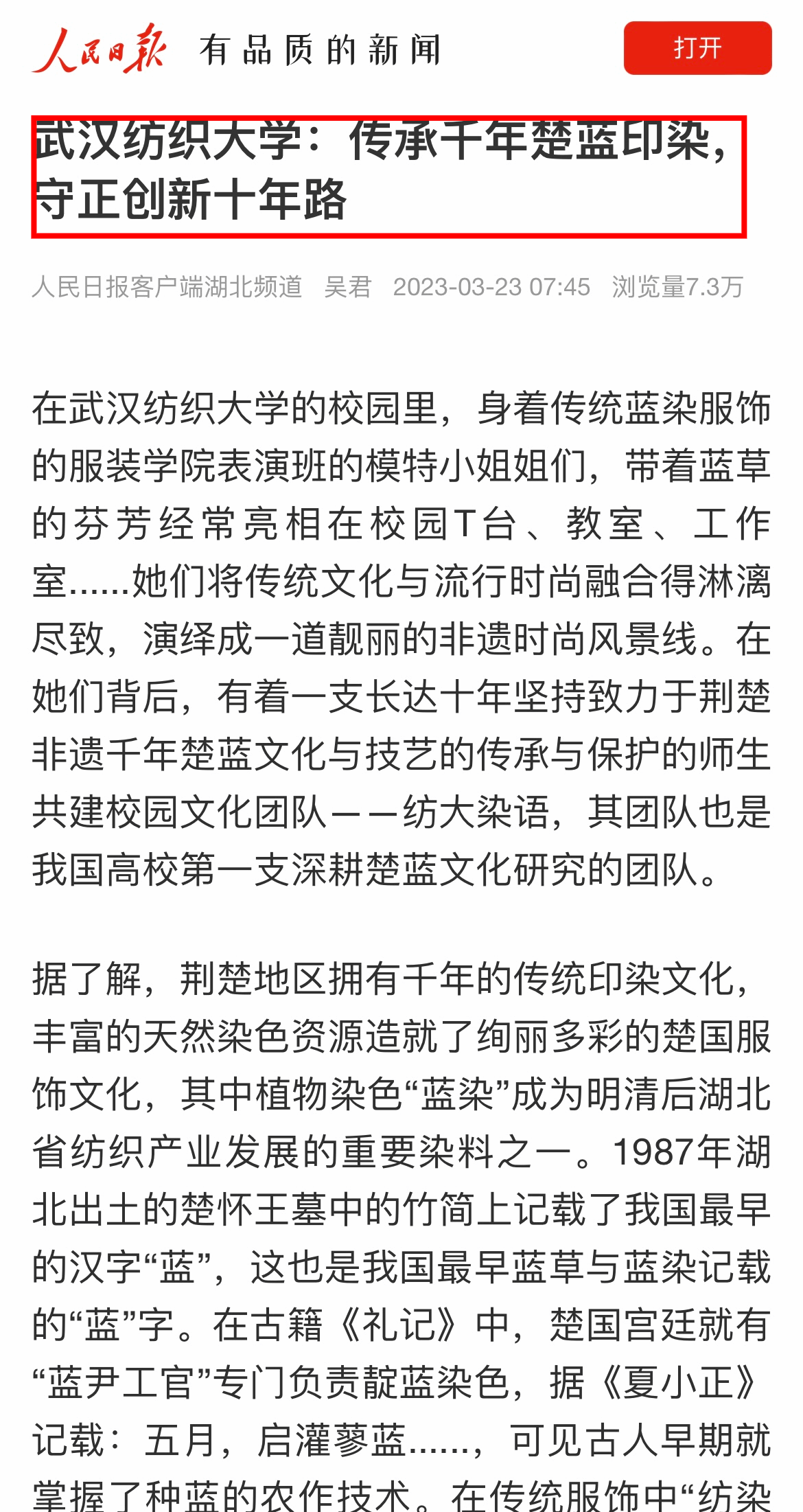 湖北省第八届大学生艺术节高校美育改革创新案例获一等奖2项,是由郎丽、赵金龙创作的《传承楚韵绣艺 弘扬纺织文化——高校中华优秀传统文化传承基地的育人模式构建》、王妮、郭泰辰创作的《非遗蓝染团队推动中华优秀传统文化传承创新案例》;二等奖1项,是由沙莎、陈继红创作的《“艺工融合”背景下针织服装设计校企协同创新人才培养模式探索与实现》。