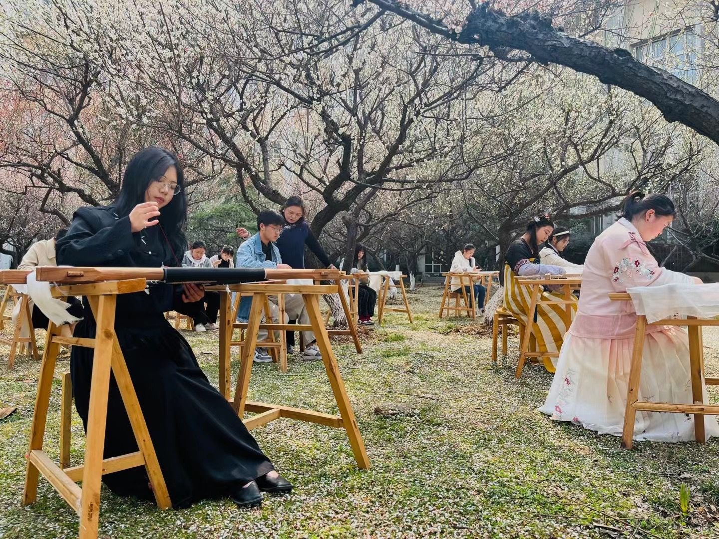 (服装学子在开展汉绣技艺学习实践)