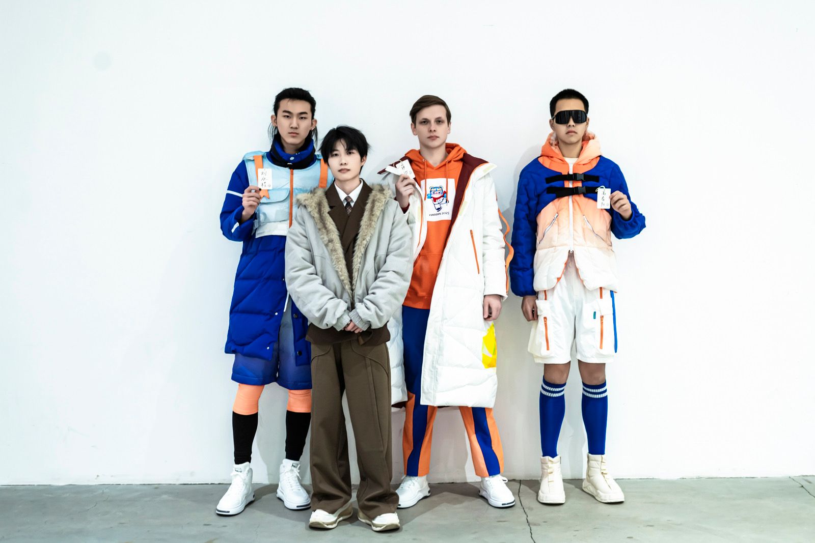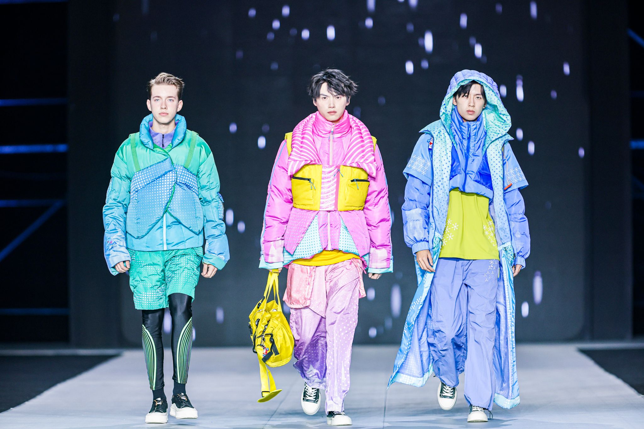 设计理念源自哈尔滨的建筑线条,设计师从建筑中汲取的元素与现代服装结合,大量运用分割、绗线、反光刻字膜等工艺,展现服装的实用性与时尚性。图案设计将建筑剪影与皮影戏中的雪花纹进行创新转化,利用点的大小和位置变化,创造活泼又具有现代感的图案。将亚冬会色彩系统融入设计,以高饱和度的蓝色、紫红色和绿色为主色调,既从色彩上点题,也为服装带来强烈的视觉冲击力和着装活力。