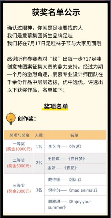 6月28日,爱慕集团“绘”出每一步717足哇创意袜图案征集大赛公示获奖名单,百合小说