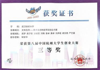 2021级研究生周梦团队的项目《无有包饰——橡木生态树皮项目创业方案》荣获钱塘赛区三等奖!根据大赛政策,周梦团队于一年内在杭州落地转化,可申请20万元的资助。