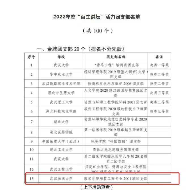 服工12001班团支部荣获湖北省2022年度“百生讲坛”活力“金牌团支部”称号。这是我校在此项赛事上取得的历史性突破。