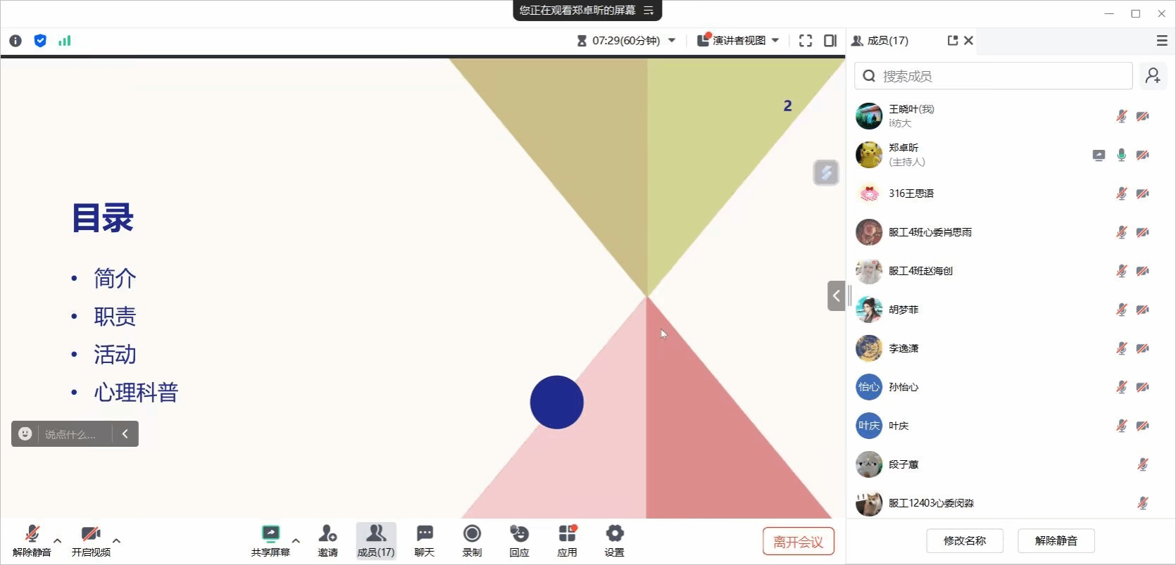 本次会议主要围绕心理委员展开讨论。新生踏入校园之际,往往会被迷茫、焦虑乃至抑郁等不良心理状况所困扰。在此情形下,心理委员的重要性便得以凸显,其肩负着为同学们排忧解难、疏导心理问题以及缓解压力的重任。无论是心理委员,还是依心小屋的成员,都理应积极主动地投入到解决这些心理问题的工作当中,通过温暖关怀,为同学们营造一个健康、和谐、积极向上的心理环境,助力他们顺利度过新生适应期,开启美好的校园生活篇章。