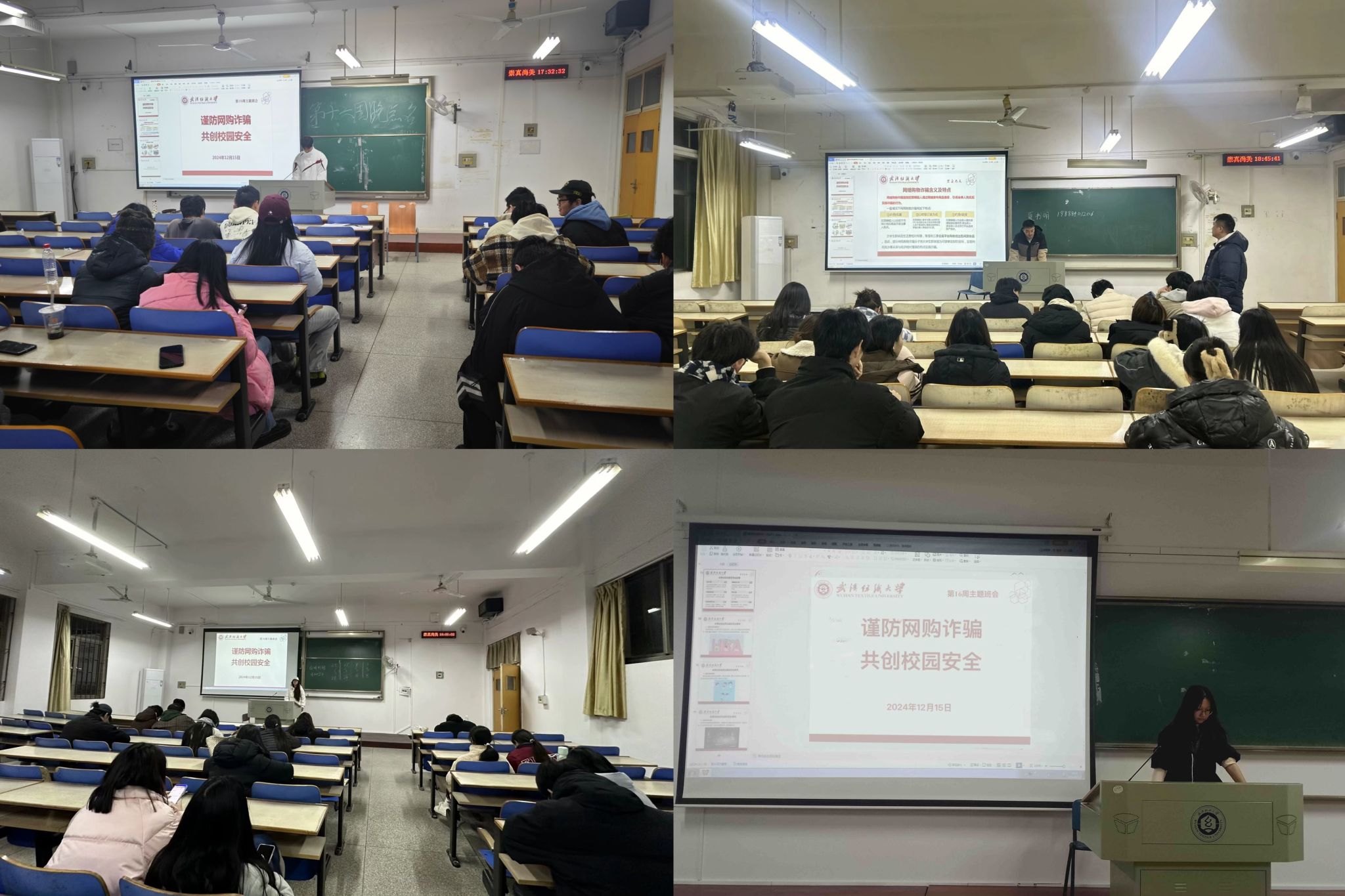 为帮助学生有效防范网购诈骗,班会还分享了一系列反诈技巧。包括保持警惕,选择正规官方平台购物,仔细阅读商品详情和评论;守好个人信息,不随意点击不明链接,谨慎填写收货地址和联系方式;不贪小便宜,避免使用不明来源的第三方支付平台,不轻易向陌生人转账;谨慎点击链接,尤其是涉及个人信息和资金安全的链接;不随意下载来源不明的软件等。同时,特别提醒学生在“双十二”期间要警惕虚假红包、扫码骗局、信用卡提升额度诈骗及退货理赔诈骗等。
