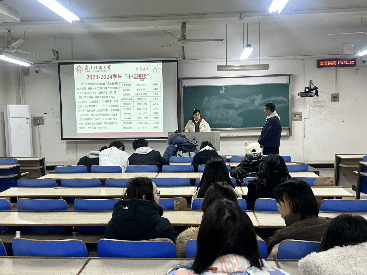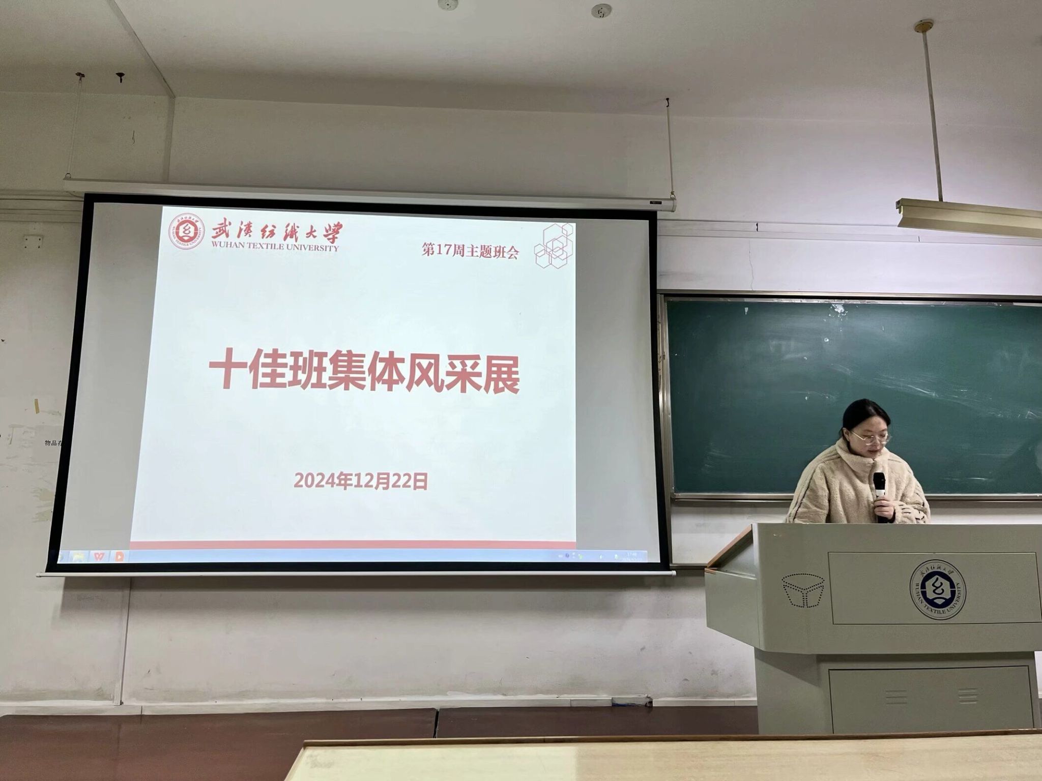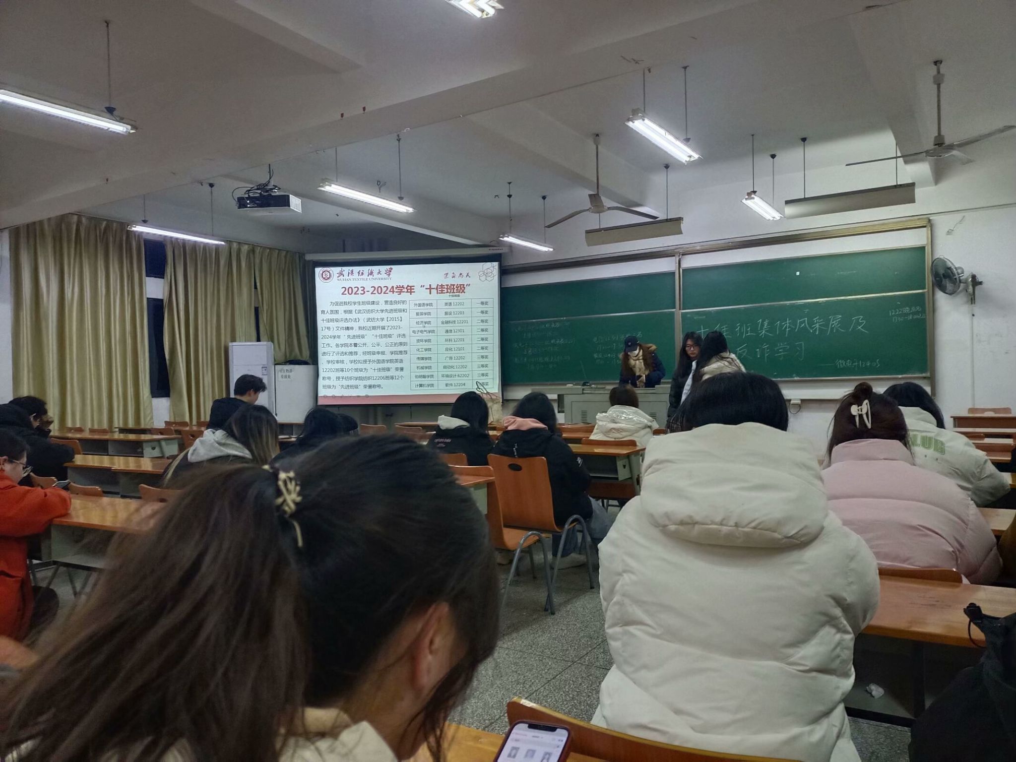 服设 12203 班的突出表现成为了班会的重要亮点。该班学生勤奋努力、积极进取,班级成员平均绩点 3.15,普通话二甲通过率达 95%,英语四级报考通过率为 90%,在学业上成绩斐然。在各类竞赛中,他们荣获国家级奖项 4 项、省级奖项 8 项、校级奖项 106 项,充分展现了扎实的专业能力与创新精神。在奖学金方面,3 人次斩获国家级奖学金,6 人次获得校级奖学金,还有 40 余人次获得校三好学生、优秀学生干部等荣誉称号,彰显出班级整体的优秀素质。